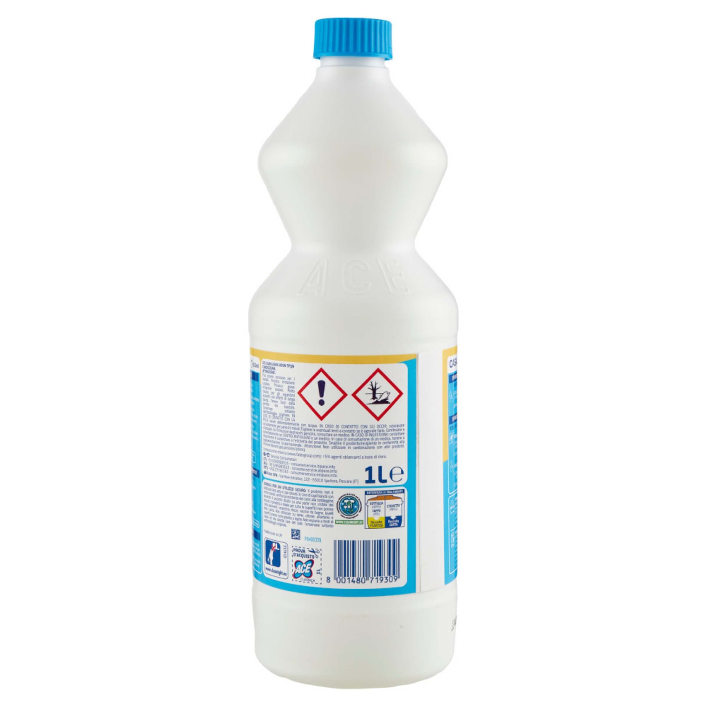 La Candeggina Ace Classica Igienizzante è ideale per garantire un'igiene profonda sia per il bucato che per la pulizia della casa. Grazie alla sua potente formula sbiancante, è efficace contro lo sporco e le macchie ostinate, offrendo un pulito impeccabile e igienizzato.• Igiene profonda: Efficace sia per il bucato che per la pulizia delle superfici della casa, garantendo la massima igiene su tutte le superfici non porose.• Composizione chimica: Contiene meno del 5% di agenti sbiancanti a base di cloro, che rimuovono facilmente le macchie più difficili.Modalità d'uso per il bucato:• In lavatrice: Aggiungi il detersivo nell'apposita vaschetta e versa la candeggina nella vaschetta dedicata, oppure nel prelavaggio.A mano: Versa 1 bicchiere di Ace in 10L d'acqua e lascia in ammollo per 20/30 minuti. Sciacqua e lava come di consueto.• Pulizia della casa:Sporco normale: Diluisci 1 bicchiere di Ace in 5L d'acqua e pulisci senza risciacquare.Sporco ostinato: Applica Ace puro direttamente sulle superfici o diluisci 2 bicchieri in 5L d'acqua.Ingredienti principali:• Agenti sbiancanti a base di cloro (<5%)Consigli d'uso:• Non utilizzare su lana, seta, capi colorati o superfici porose come legno o granito. Verifica la resistenza dei colori su tessuti colorati.• Ideale per pavimenti, ceramiche, docce, vasche da bagno e lavelli della cucina.Avvertenze:• Può essere corrosivo per i metalli. Provoca irritazione cutanea e grave irritazione oculare.• Molto tossico per gli organismi acquatici con effetti di lunga durata. Tenere fuori dalla portata dei bambini.• Non utilizzare in combinazione con altri prodotti per evitare la formazione di gas pericolosi (cloro).Codice UFI: 6U80-20KK-H00N-TPQN