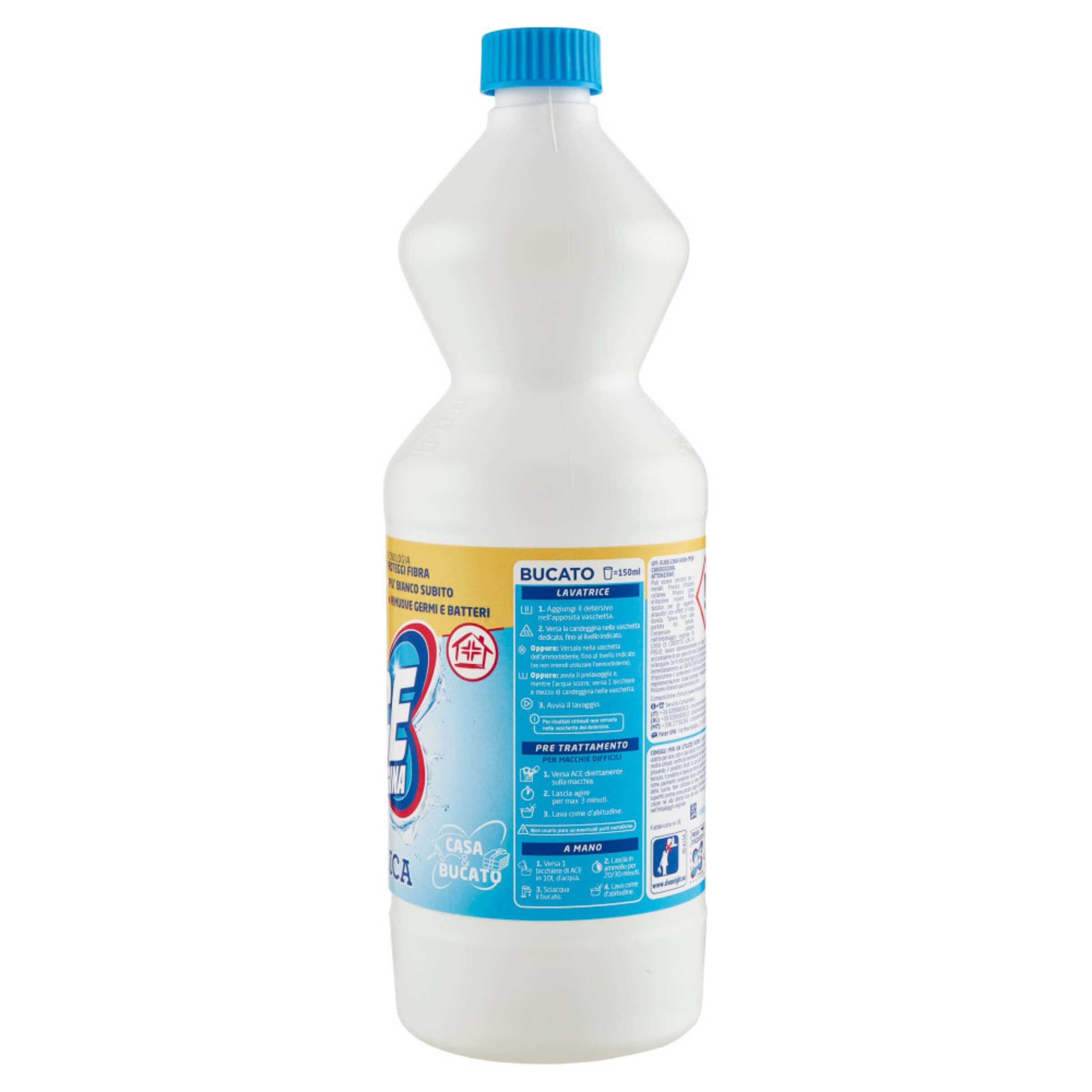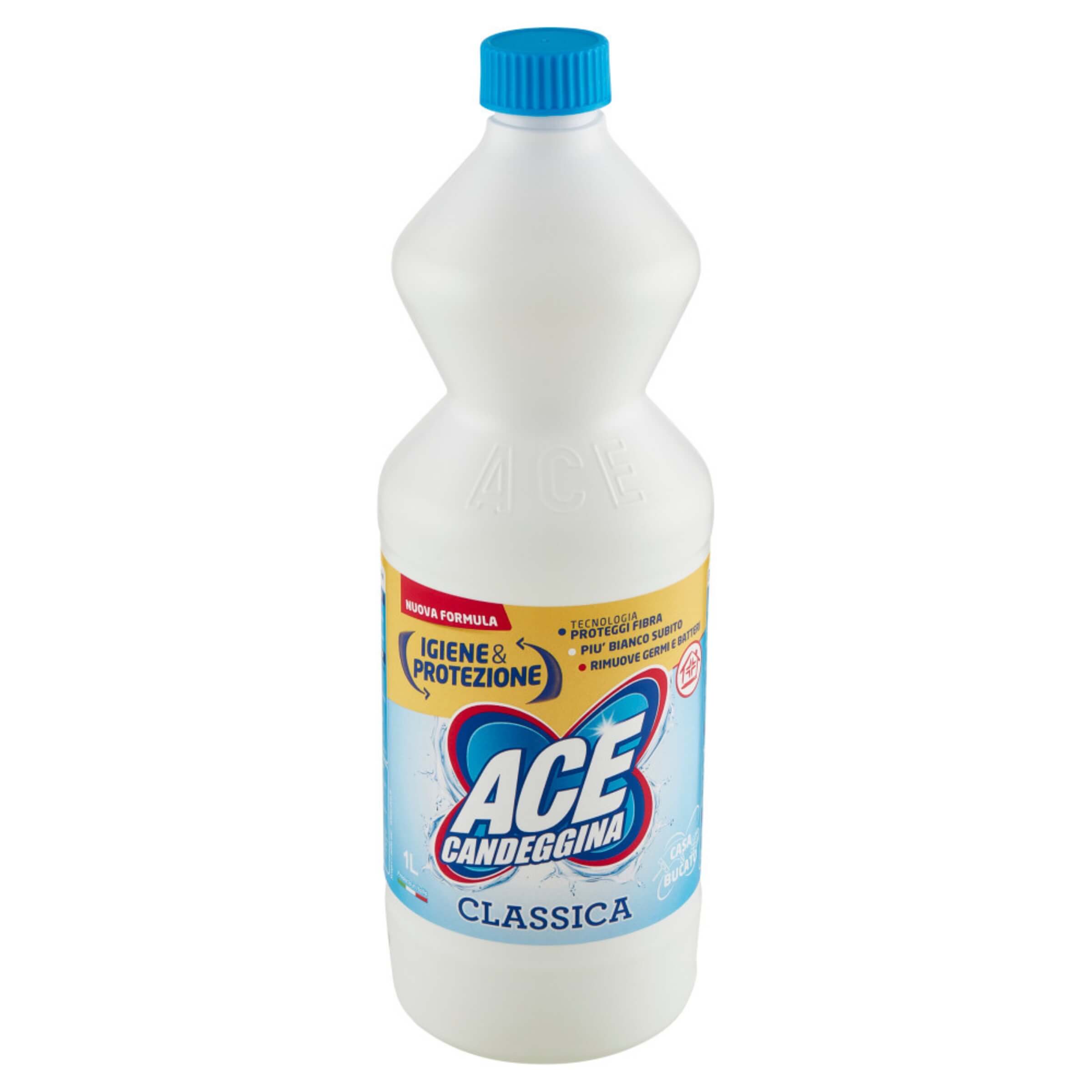 La Candeggina Ace Classica Igienizzante è ideale per garantire un'igiene profonda sia per il bucato che per la pulizia della casa. Grazie alla sua potente formula sbiancante, è efficace contro lo sporco e le macchie ostinate, offrendo un pulito impeccabile e igienizzato.• Igiene profonda: Efficace sia per il bucato che per la pulizia delle superfici della casa, garantendo la massima igiene su tutte le superfici non porose.• Composizione chimica: Contiene meno del 5% di agenti sbiancanti a base di cloro, che rimuovono facilmente le macchie più difficili.Modalità d'uso per il bucato:• In lavatrice: Aggiungi il detersivo nell'apposita vaschetta e versa la candeggina nella vaschetta dedicata, oppure nel prelavaggio.A mano: Versa 1 bicchiere di Ace in 10L d'acqua e lascia in ammollo per 20/30 minuti. Sciacqua e lava come di consueto.• Pulizia della casa:Sporco normale: Diluisci 1 bicchiere di Ace in 5L d'acqua e pulisci senza risciacquare.Sporco ostinato: Applica Ace puro direttamente sulle superfici o diluisci 2 bicchieri in 5L d'acqua.Ingredienti principali:• Agenti sbiancanti a base di cloro (<5%)Consigli d'uso:• Non utilizzare su lana, seta, capi colorati o superfici porose come legno o granito. Verifica la resistenza dei colori su tessuti colorati.• Ideale per pavimenti, ceramiche, docce, vasche da bagno e lavelli della cucina.Avvertenze:• Può essere corrosivo per i metalli. Provoca irritazione cutanea e grave irritazione oculare.• Molto tossico per gli organismi acquatici con effetti di lunga durata. Tenere fuori dalla portata dei bambini.• Non utilizzare in combinazione con altri prodotti per evitare la formazione di gas pericolosi (cloro).Codice UFI: 6U80-20KK-H00N-TPQN
