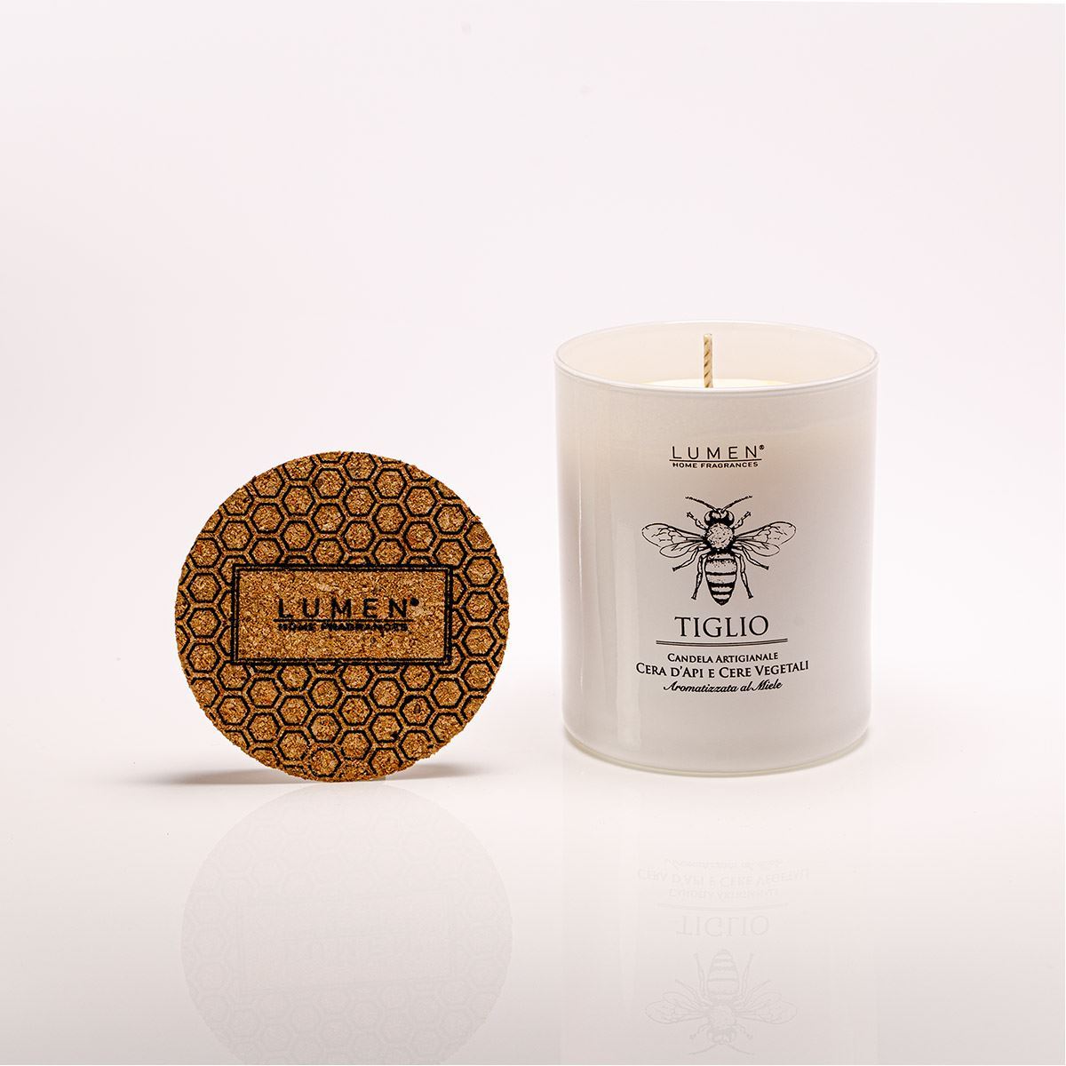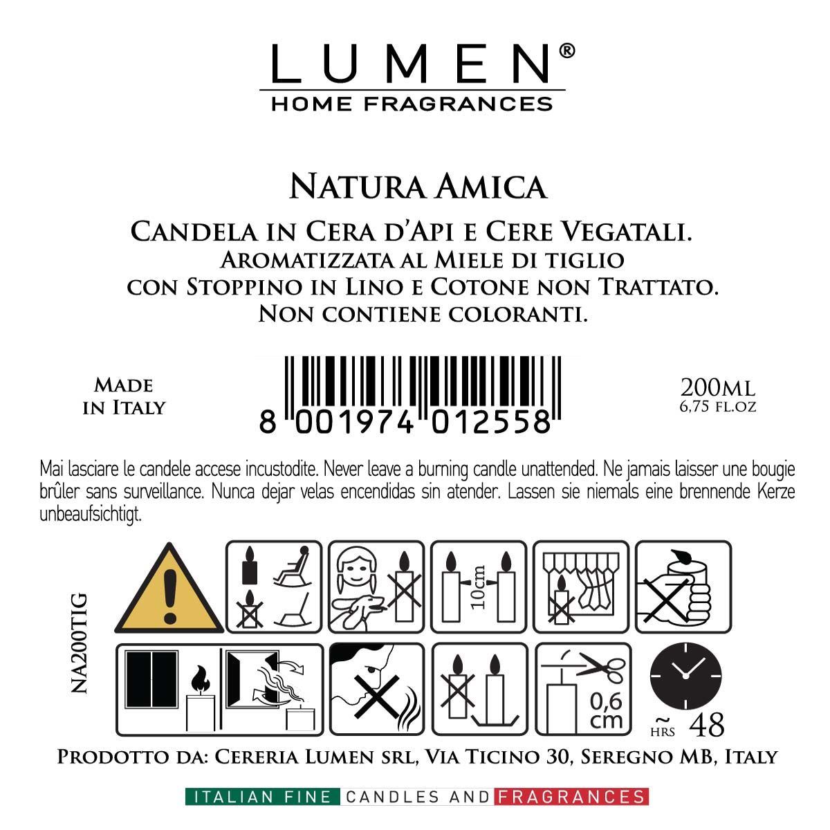 La candela Lumen Natura Amica in cera d'api e cera vegetale con profumazione al miele di tiglio porta negli ambienti domestici un'atmosfera morbida, luminosa e naturalmente avvolgente. La sua fragranza si ispira al profumo caldo e dolce del miele unito alla delicatezza floreale del tiglio, creando una sensazione rassicurante che evoca momenti di serenità all'aria aperta. La miscela di cere naturali assicura una combustione stabile e regolare, mentre il vetro verniciato e serigrafato aggiunge un tocco elegante che si integra con qualsiasi stile d'arredo. Il tappo in sughero serigrafato, ricco di richiami al mondo dell'apicoltura, completa un prodotto pensato per un uso quotidiano raffinato e consapevole. Una volta terminata la candela, il contenitore può essere facilmente riutilizzato, trasformandosi in un elemento decorativo che prolunga il valore del prodotto nel tempo.• Cera naturale: La miscela di cera d'api e cera vegetale garantisce una combustione uniforme e costante, valorizzando materiali naturali selezionati per qualità, purezza e sicurezza, ideali per un utilizzo quotidiano in qualsiasi ambiente.• Profumazione miele di tiglio: La nota olfattiva fonde la rotondità della cera d'api con la dolcezza del miele e l'aroma delicatamente floreale del tiglio, creando una fragranza equilibrata, morbida e accogliente.• Stoppino naturale: Lo stoppino in fibre di cotone e lino non trattato assicura una fiamma pulita e stabile, riducendo residui e fumo, e contribuendo a un'esperienza d'uso delicata e piacevole.• Tappo in sughero serigrafato: Il tappo mantiene la candela protetta quando non è in uso, preserva la fragranza e aggiunge un dettaglio estetico che richiama materiali naturali e lavorazioni artigianali.• Contenitore in vetro riutilizzabile: Il vetro verniciato e serigrafato può essere riutilizzato come piccolo vaso, porta matite o contenitore decorativo, offrendo una seconda vita al materiale e valorizzando la cura con cui è realizzato.Questa candela rappresenta un equilibrio tra naturalità, eleganza e benessere sensoriale, portando in casa una fragranza ispirata ai ritmi lenti della natura e alla dolcezza autentica del miele di tiglio. Prodotta in Italia e racchiusa in un astuccio stampato, offre una durata di circa 48 ore in un formato da 200 ml, con dimensioni di 80x80x105 mm. La composizione in cera d'api e cera vegetale racconta una tradizione di artigianalità e attenzione ai materiali, trasformando ogni accensione in un momento di quiete e calore.