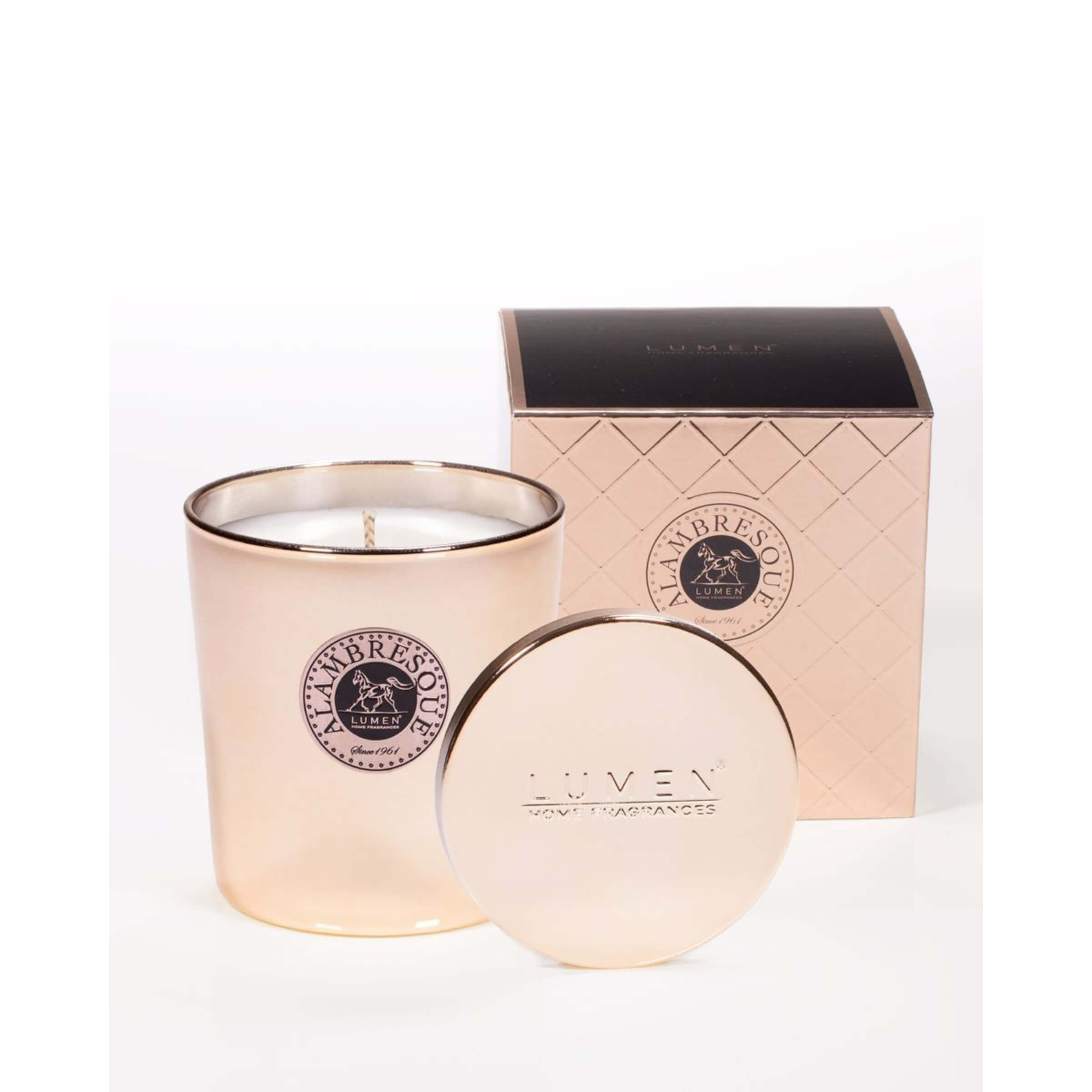 La candela di lusso Lumen Masterpiece Alambresque Rosa da 300 ml è pensata per avvolgere gli ambienti in un’aura sofisticata, femminile e intensamente elegante. Il contenitore rose gold, luminoso e riflettente, dona un’immediata impressione di ricercatezza e diventa un vero oggetto decorativo capace di impreziosire qualsiasi spazio, dai salotti moderni alle camere da letto più eleganti. La superficie liscia e lucente del vetro, abbinata al coperchio coordinato anch’esso con finitura metallica, crea un insieme armonioso e raffinato che riflette la luce della fiamma dando vita a giochi luminosi caldi e preziosi. Ogni dettaglio, dalla grafica del pack alle linee pulite del contenitore, racconta la tradizione artigianale dell’Opificio Cerario Lumen e la sua maestria nella creazione di fragranze d’atmosfera dal 1961.