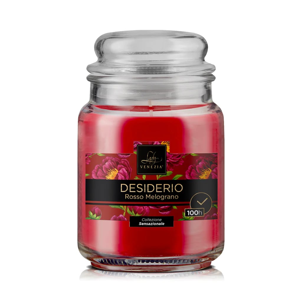 Sperimenta la passione e l'eleganza del melograno rosso con la candela profumata "Desiderio". Parte della Collezione Sensazionale, questa candela è pensata per creare un'atmosfera sofisticata e avvolgente, ideale per momenti di relax o serate romantiche.• Durata fino a 100 ore : offre un profumo persistente e avvolgente per molte ore, perfetto per accompagnare le tue giornate o serate speciali con un tocco di lusso.• Fragranza al Rosso Melograno : Una fragranza intensa e ricca che unisce note dolci e fruttate, evocando sensualità ed eleganza in ogni ambiente della tua casa.• Design raffinato : Il colore rosso acceso del contenitore in vetro aggiunge un tocco di carattere e stile, arricchendo il tuo spazio con un elemento decorativo unico.• Collezione Sensazionale : Realizzata con materiali di alta qualità, questa candela combina design e profumazioni esclusive per soddisfare anche i gusti più esigenti.Ideale per chi desidera un'atmosfera ricercata e piena di emozioni, la candela profumata "Desiderio" al rosso melograno è una scelta perfetta per donare un tocco di raffinatezza e calore al tuo ambiente.