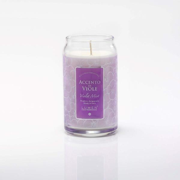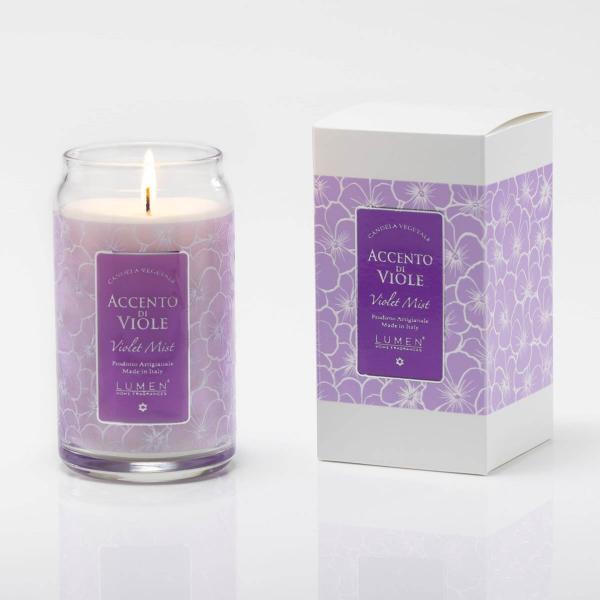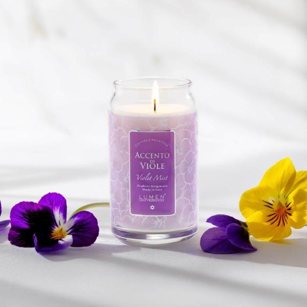 La candela vegetale Lumen Accento di Viole in giara di vetro da 300 ml esprime una fragranza raffinata e avvolgente, costruita attorno al carattere elegante della violetta. Una volta accesa, diffonde nell'ambiente un profumo floreale morbido e armonioso, arricchito da sfumature fruttate e da un delicato fondo gourmand che dona rotondità alla composizione. La violetta si apre con leggerezza e definizione, accompagnata da accordi luminosi che rendono l'atmosfera accogliente e curata. La giara in vetro trasparente valorizza la tonalità lilla della grafica, trasformando la candela in un elemento decorativo adatto a soggiorni, camere da letto e spazi dedicati al relax.• Capacità Contenitore: Giara in vetro con capienza di 300 ml, progettata per garantire stabilità e sicurezza durante la combustione.• Composizione Della Cera: Candela realizzata con cera vegetale e stoppino in cotone non trattato, per una combustione regolare e uniforme.• Piramide Olfattiva Testa: Note di testa composte da viola e fiori bianchi, che definiscono l'impatto iniziale fresco e floreale.• Piramide Olfattiva Cuore: Accordo centrale con ribes nero, che aggiunge una sfumatura fruttata e leggermente intensa.• Piramide Olfattiva Fondo: Note di fondo a base di caramello e frutti di bosco, responsabili della dolcezza delicata e della persistenza aromatica.• Riutilizzo Contenitore: Una volta terminata la candela, il bicchiere in vetro di alta qualità può essere riutilizzato come vaso porta fiori o porta oggetti da scrivania.• Confezione: Astuccio coordinato con etichetta serigrafata in argento a spessore, pensato per proteggere il prodotto e valorizzarne la presentazione, ideale anche come idea regalo.Accento di Viole con fragranza Violet Mist unisce eleganza e semplicità in una composizione floreale e fruttata equilibrata, dove la viola spicca su un leggero fondo caramellato. La combinazione tra cera vegetale, vetro di qualità e struttura olfattiva definita rende questa candela un complemento decorativo e profumato capace di accompagnare con discrezione i momenti quotidiani.NOTE DI TESTA: Viola, Fiori BianchiNOTE DI CUORE: Ribes Nero, NOTE DI FONDO: Caramello, Frutti di Bosco
