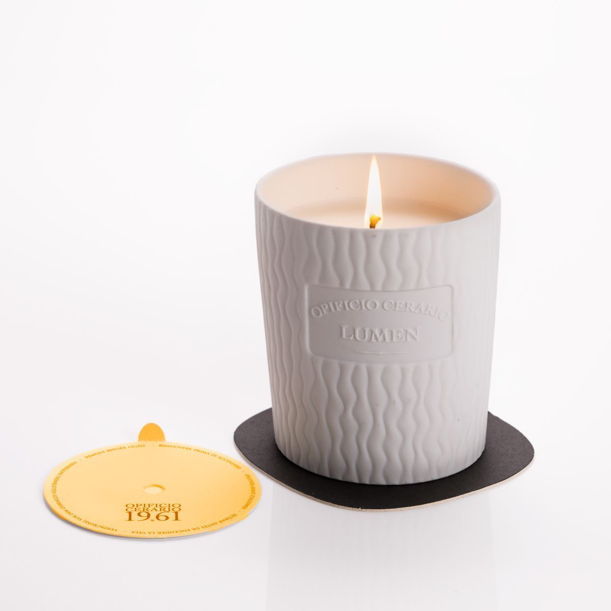 La candela vegetale Lumen Muda d’Oriente in vaso di porcellana da 300 ml è pensata per evocare l’atmosfera ricca, calda e misteriosa dei viaggi lungo le antiche rotte d’oriente. Il vaso in porcellana bianca, caratterizzato da una superficie a rilievo elegante e materica, conferisce alla candela un’estetica raffinata e senza tempo, capace di integrarsi con naturalezza in qualsiasi ambiente della casa. La porcellana, morbida alla vista e solida al tatto, trasforma il contenitore in un autentico oggetto d’arredo che continua a vivere anche oltre la durata della candela. Il coperchio in legno naturale, disegnato da Lumen, permette di proteggere la fragranza preservandone la qualità e aggiunge un tocco di artigianalità autentica che richiama materiali veri, caldi e naturali. La luce della fiamma, riflessa dalle pareti chiare del vaso, diffonde un bagliore morbido e avvolgente che amplifica la sensazione di benessere sensoriale.