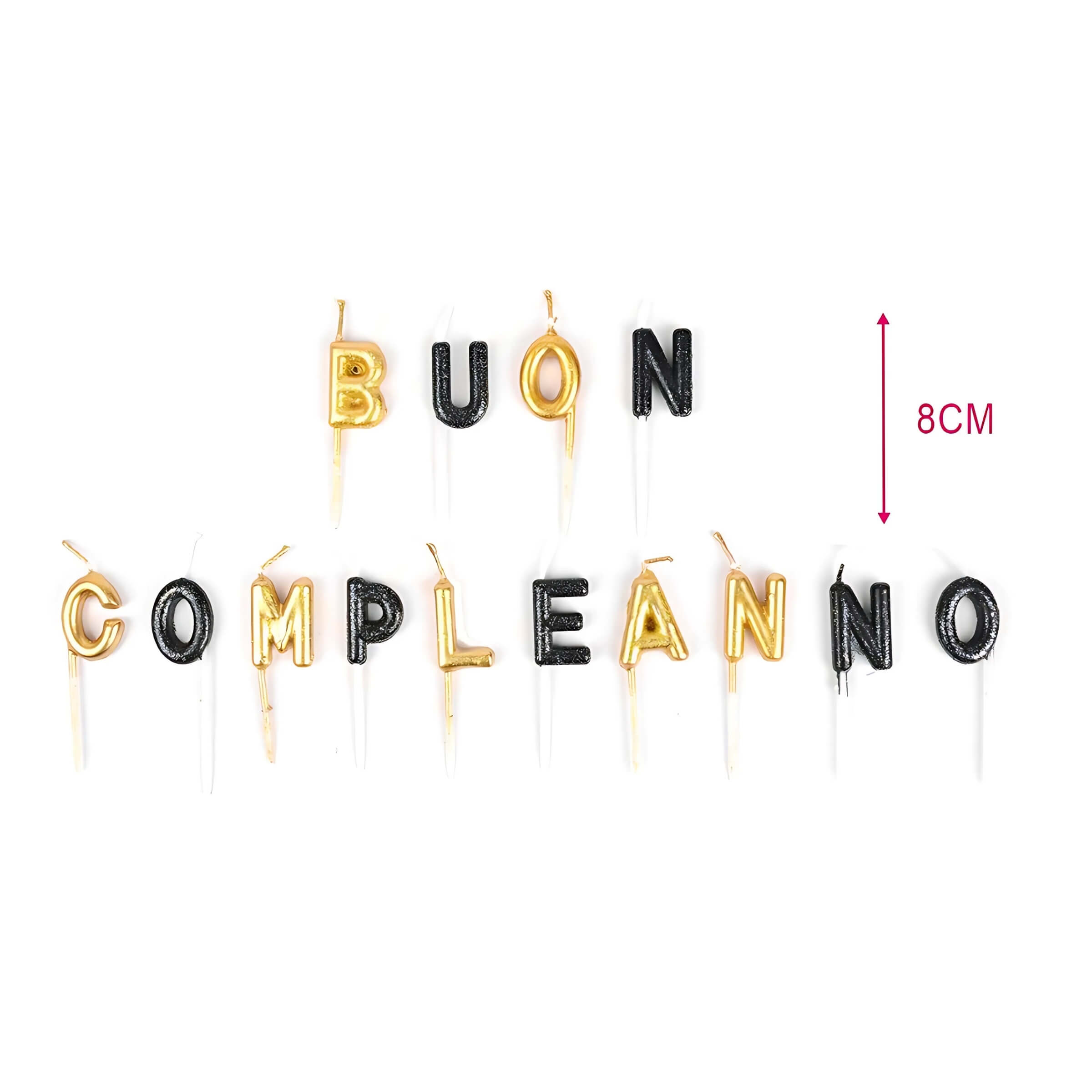 Rendi la torta di compleanno elegante e scenografica con il set di candeline a lettere "Buon Compleanno" nei raffinati colori oro e nero. Perfette per aggiungere un tocco di stile e originalità, queste candeline tridimensionali sono pensate per chi desidera una decorazione d'effetto, moderna e diversa dalle classiche soluzioni colorate.• Contenuto della confezione: Il set include 14 candeline a forma di lettera, composte dalla scritta completa "BUON COMPLEANNO". Le lettere sono alternate in colorazione oro lucido e nero glitterato, offrendo un contrasto visivo elegante e dinamico, ideale per feste raffinate o a tema.• Modalità di utilizzo: Ogni lettera è montata su uno stelo in plastica rigida che consente di fissare facilmente le candeline sulla torta. La disposizione può essere personalizzata a seconda dello spazio e dello stile della decorazione. L’accensione avviene facilmente grazie allo stoppino in cima a ogni lettera.• Dimensioni: Le candeline misurano circa 8 cm in altezza totale, inclusa la base, risultando ben visibili sulla torta senza appesantire la composizione estetica. L’altezza permette di dare risalto al messaggio mantenendo armonia con le dimensioni del dolce.• Occasioni d’uso: Perfette per compleanni di adulti, party a tema elegante, feste serali o eventi speciali, queste candeline sono ideali per dare un tocco distintivo alla torta e creare foto di grande impatto. L’effetto oro e nero è particolarmente indicato per ambientazioni chic, glamour o sofisticate.• Composizione e materiali: Le lettere sono realizzate in cera colorata di alta qualità con effetto metallizzato e glitter. La base in plastica rigida è pensata per garantire stabilità durante l’uso e sicurezza a contatto con il dolce.Il set candeline “Buon Compleanno” in oro e nero è il dettaglio che trasforma ogni torta in un vero e proprio centrotavola. Una scelta di stile per chi ama celebrare con classe, senza rinunciare alla creatività.Avvertenze: Prodotto da utilizzare sotto la supervisione di un adulto. Non lasciare incustodite le candeline accese. Assicurarsi che siano completamente spente prima dello smaltimento.