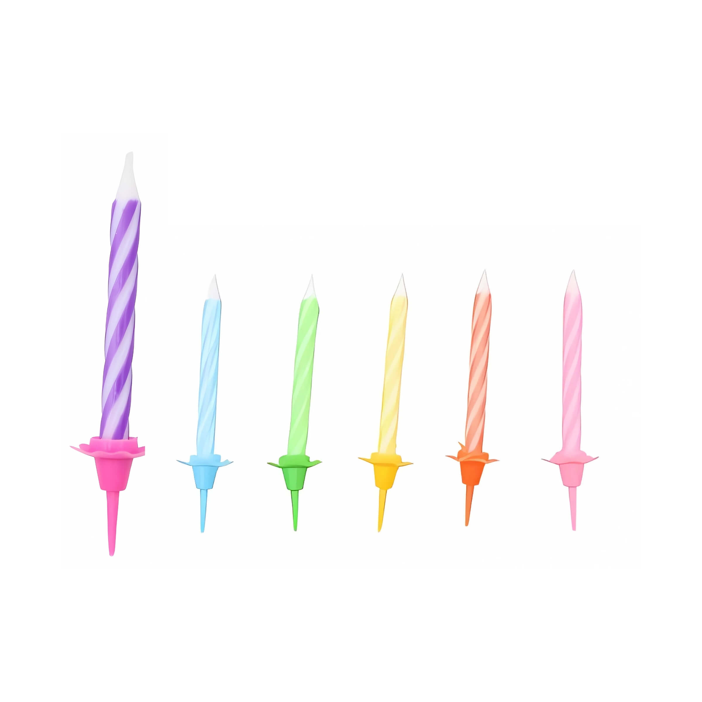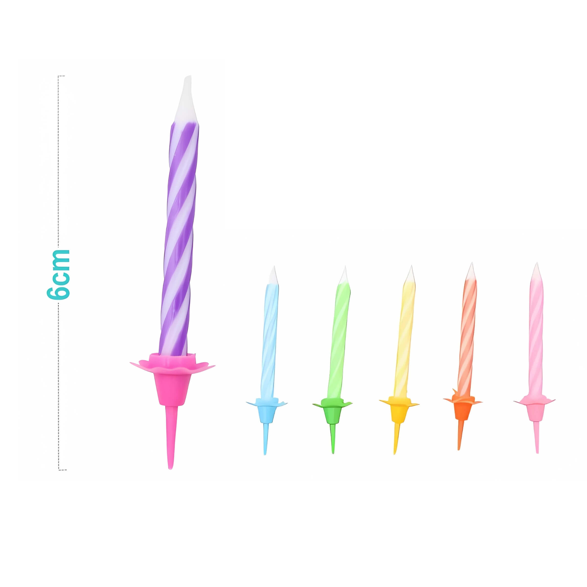 Le candeline a spirale colorate da 6 cm sono la scelta perfetta per aggiungere un tocco di colore e vivacità a ogni torta di compleanno. Realizzate con un design classico a spirale e disponibili in tonalità assortite pastello, queste candeline sono ideali per decorare con eleganza e semplicità qualsiasi dolce da festa.• Contenuto della confezione: Il set include 24 candeline a spirale da 6 cm in sei colori assortiti (blu, verde, giallo, arancione, rosa e lilla) e 12 basette in plastica colorata abbinate, utili per fissare facilmente le candeline sulla torta in modo stabile e sicuro.• Modalità di utilizzo: Le candeline possono essere utilizzate con o senza le basette incluse, a seconda del tipo di torta. Le basette permettono un’inserzione facile anche in torte più morbide, migliorando la stabilità durante l'accensione. Lo stoppino garantisce una fiamma regolare e duratura per il momento del soffio.• Dimensioni: Ogni candelina misura circa 6 cm di altezza, esclusa la basetta. Le dimensioni compatte le rendono adatte per ogni tipo di torta, senza sovrastare la decorazione ma restando ben visibili e armoniose.• Occasioni d’uso: Perfette per compleanni di tutte le età, queste candeline possono essere utilizzate anche per feste tematiche, anniversari, celebrazioni scolastiche o eventi aziendali. I colori tenui e brillanti le rendono versatili e ideali per qualsiasi stile di decorazione.• Composizione e materiali: Le candeline sono realizzate in cera di alta qualità, con finitura a spirale, mentre le basette sono in plastica resistente e riutilizzabile. Entrambi i materiali sono sicuri per l'uso alimentare.Il set da 24 candeline a spirale con 12 basette è un accessorio indispensabile per ogni festa. Facili da usare, colorate e resistenti, donano un tocco speciale a ogni momento da celebrare, rendendo la torta ancora più scenografica.Avvertenze: Prodotto da utilizzare sotto la supervisione di un adulto. Non lasciare incustodite le candeline accese. Assicurarsi che siano completamente spente prima dello smaltimento.