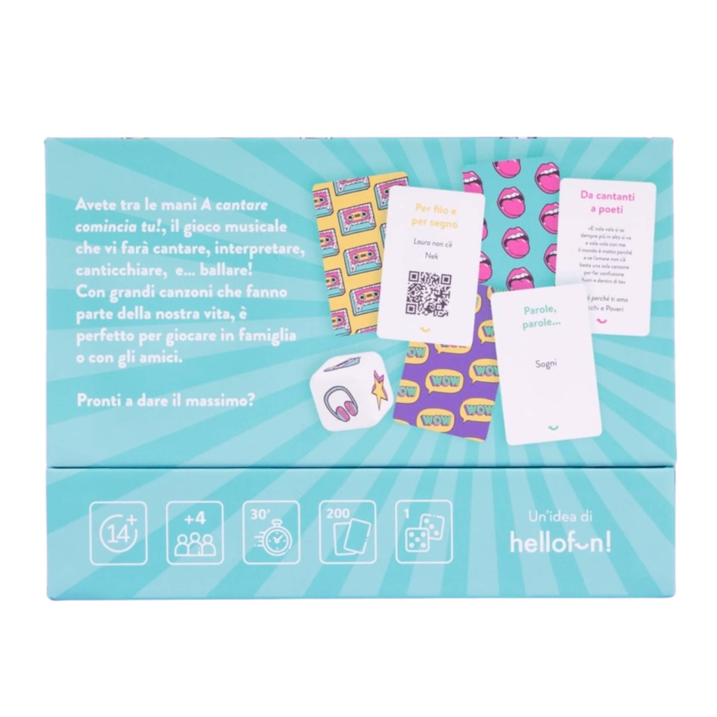 Il gioco di carte A cantare comincia tu! di Hellofun è una vera esplosione di divertimento, pensato per trasformare ogni incontro tra amici o familiari in un'esperienza musicale indimenticabile. Questo gioco invita tutti a mettersi in gioco cantando, canticchiando, interpretando o ballando sulle note delle canzoni che hanno segnato momenti importanti della nostra vita. Con un mix irresistibile di sfide musicali, spirito di squadra e tanta allegria, A cantare comincia tu! è il compagno perfetto per serate spensierate, feste di compleanno, cene tra amici o pomeriggi in famiglia.