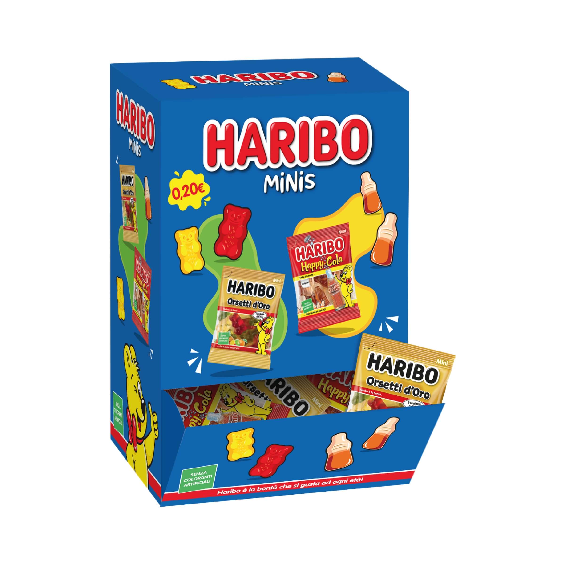 Haribo Minis è un’esplosione di gusto in formato mini che racchiude due iconiche varianti: gli intramontabili Orsetti d’Oro e le classiche bottigliette Happy Cola. Pensato per offrire un mix di sapori classici e divertenti, questo espositore è studiato per catturare l’attenzione del cliente e stimolare l’acquisto d’impulso con un packaging colorato e dinamico.• Mix assortito irresistibile: all’interno del box troverai 170 bustine da 20 g, suddivise in 85 pezzi Orsetti d’Oro e 85 pezzi Happy Cola. Gli Orsetti d’Oro offrono un gusto fruttato classico, mentre le bottigliette Happy Cola richiamano l’inconfondibile sapore di cola, amato da tutte le età.• Veggie Friendly: le caramelle Haribo Minis sono senza gelatina animale, perfette per chi segue un’alimentazione vegetariana senza rinunciare al piacere di un dolce momento.• Senza coloranti artificiali: tutti i gusti inclusi sono privi di coloranti artificiali, per un’esperienza di consumo più naturale e trasparente.• Confezione pronta all’uso: il display da banco è progettato per essere immediatamente esposto, con un design vivace che valorizza i singoli mini-pack e facilita la scelta del cliente.Haribo Minis è la soluzione ideale per donare un tocco di allegria e varietà agli scaffali del tuo punto vendita. Grazie al formato mini, al mix di sapori amati da tutte le età e a un packaging accattivante, questo espositore garantisce alta visibilità, rotazione veloce e soddisfazione del cliente.
