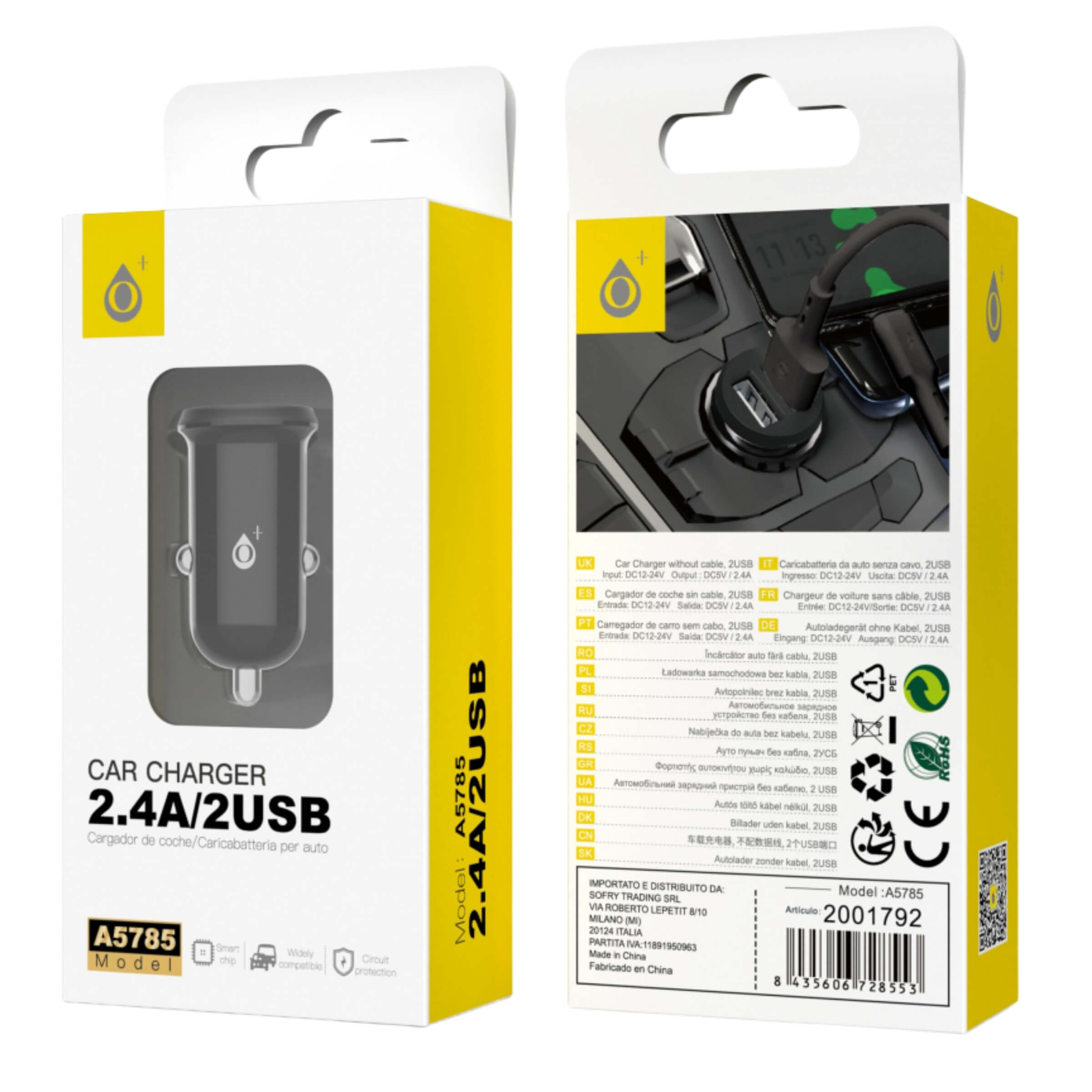 Questo caricatore per auto Proteo offre una soluzione di ricarica efficace e pratica.• Doppia Porta USB: Dotato di 2 porte USB, permette di caricare due dispositivi simultaneamente.• Materiali Resistenti: Realizzato in ABS, garantisce durabilità e resistenza.• Ampia Compatibilità di Ingresso: Con un ingresso DC 12-24V, è adatto a quasi tutti i modelli di auto.• Alta Potenza di Uscita: Offre un'uscita totale di 5V/2.4A, permettendo una ricarica veloce per i tuoi dispositivi.Il caricatore da auto A5785 NE è perfetto per chi ha bisogno di ricaricare i propri dispositivi in movimento, combinando potenza e praticità.