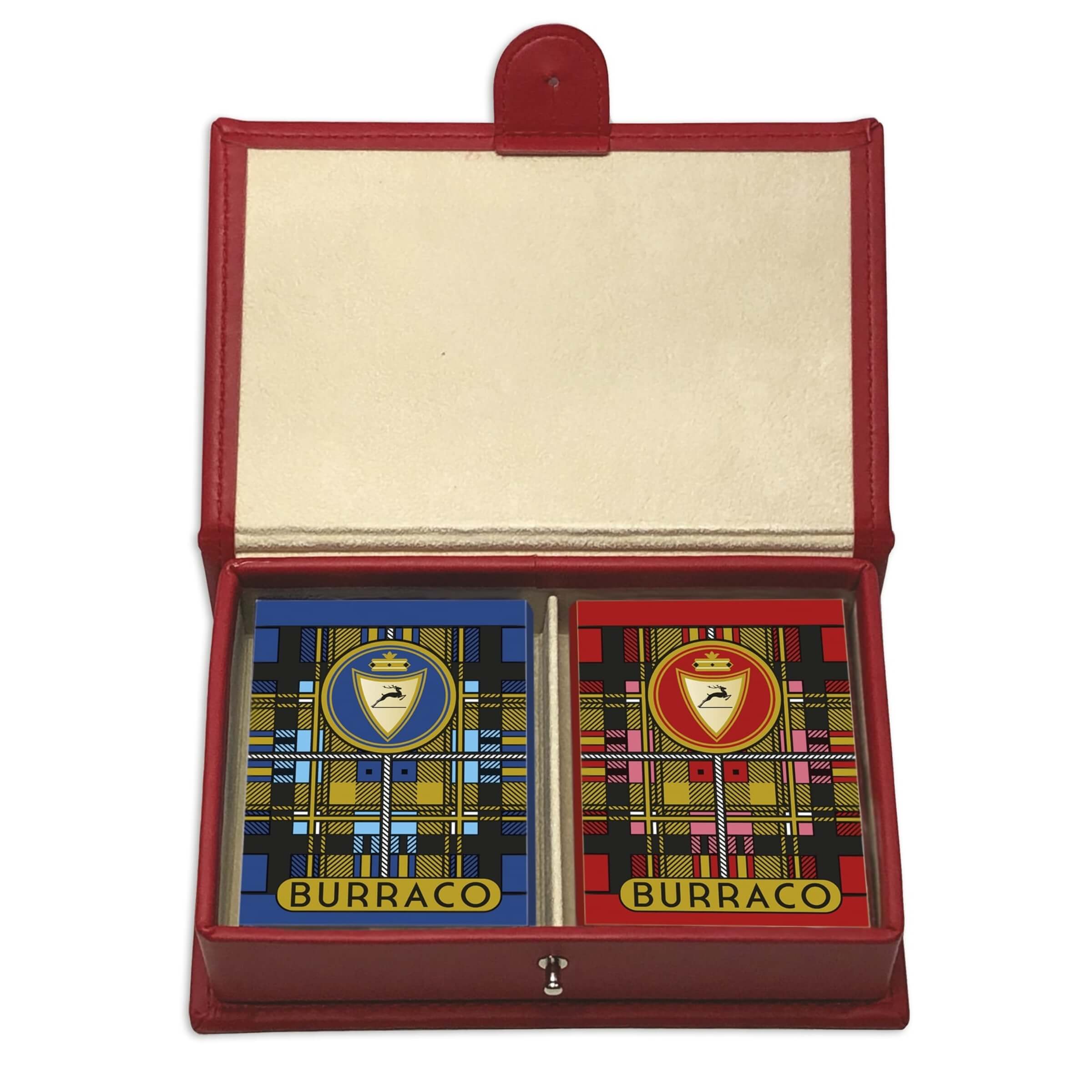 Le Carte Modiano Burraco Scozzese sono il perfetto connubio tra eleganza, qualità e funzionalità, ideali per gli appassionati del Burraco che desiderano un set raffinato e durevole. Contenute in un esclusivo astucciò in simil pelle rosso, queste carte sono perfette sia per il gioco quotidiano che come idea regalo prestigiosa.• Astuccio elegante con accessori inclusi: Il set comprende un raffinato astuccio in simil pelle rossa, dotato di penna e block notes, perfetti per segnare i punteggi durante le partite e mantenere un'organizzazione impeccabile del gioco.• Set completo con 2 mazzi da 54 carte: Ogni confezione include due mazzi da 54 carte ciascuno, realizzati per il Burraco con l’esclusiva pinella al 2, rendendo ogni partita ancora più coinvolgente e fedele alle regole ufficiali.• Materiale di alta qualità: Le carte sono realizzate in cartoncino Duplex da 320 g, una scelta che garantisce resistenza e durata nel tempo, mantenendo una perfetta scorrevolezza e maneggevolezza durante il gioco.• Design raffinato con rovescio scozzese: Il dorso delle carte presenta un motivo scozzese in due varianti di colore, blu e rosso, con un design esclusivo e dettagli curati che aggiungono un tocco di classe al set.• Formato ideale per il gioco: Le carte hanno dimensioni 63 x 88 mm, perfette per una presa comoda e una leggibilità ottimale, rendendo il gioco ancora più fluido e piacevole.• Imballaggio pratico e resistente: L’astuccio è studiato per proteggere le carte da eventuali danni, mantenendole sempre in condizioni ottimali e facilitando il trasporto per chi ama giocare ovunque.Le Carte Modiano Burraco Scozzese sono il set ideale per chi desidera un’esperienza di gioco elegante e impeccabile. Grazie alla loro resistenza, alla qualità dei materiali e al prestigioso astuccio in simil pelle, rappresentano una scelta perfetta per ogni appassionato del Burraco.