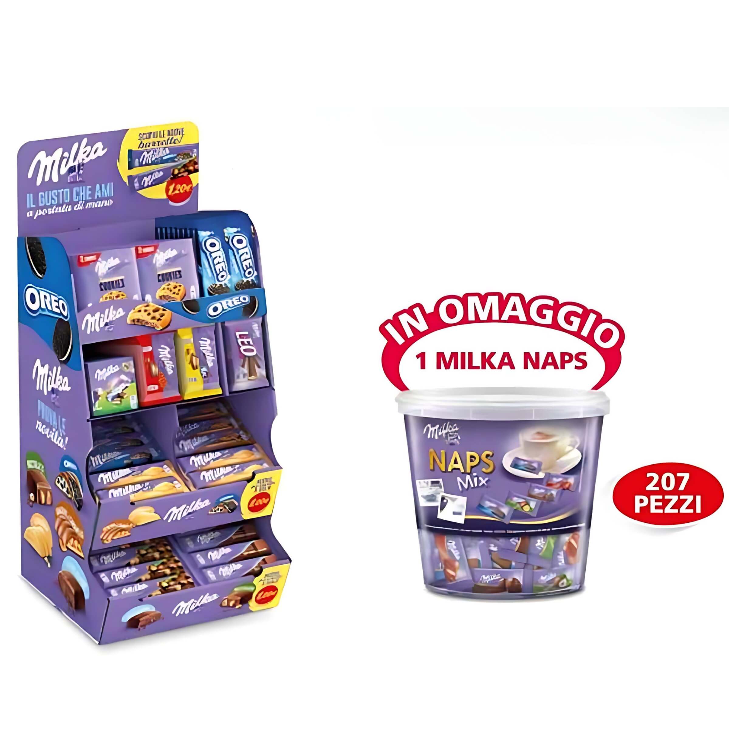 • Confezione omaggio: Il set è arricchito da 1 kg di praline Milka Naps Mix (207 pezzi), confezionate in un secchiello richiudibile, perfette da esporre o regalare ai clienti.