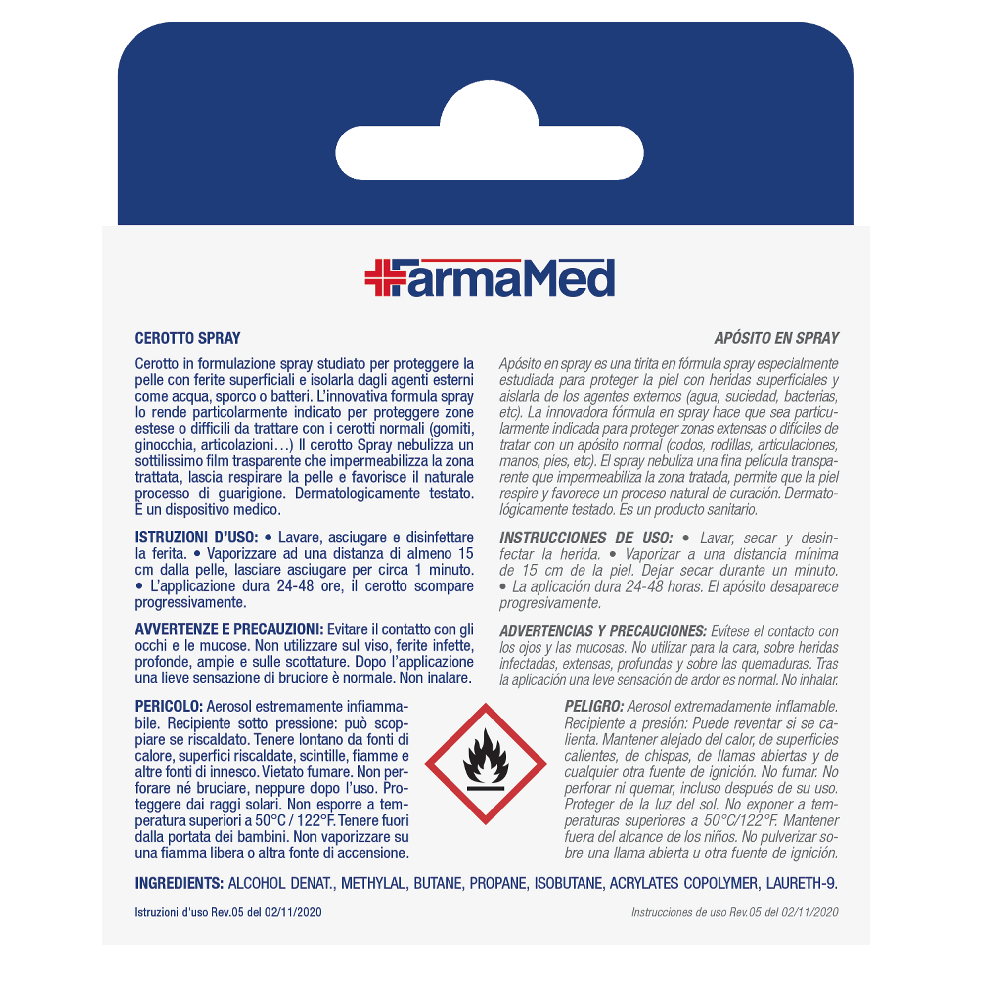 CEROTTO IN FORMULAZIONE SPRAY STUDIATO PER PROTEGGERE LA PELLE CON FERITE SUPERFICIALI ED ISOLARLE DAGLI AGENTI ESTERNI (ACQUA, SPORCO, BATTERI, ECC). INDICATO PER PROTEGGERE ZONE ESTESE O ZONE DIFFICILMENTE TRATTABILI CON UN NORMALE CEROTTO (GOMITI, GINOCCHIA, ARTICOLAZIONI, MANI E PIEDI, ECC). LO SPRAY NEBULIZZA UN SOTTILISSIMO FILM TRASPARENTE CHE IMPERMEABILIZZA LA ZONA TRATTA, LASCIA RESPIRARE LA PELLE, FAVORISCE IL NATURALE PROCESSO DI GUARIGIONE E PROTEGGE LE FERITE SUPERFICIALI DA ACQUA SPORCO E BAT