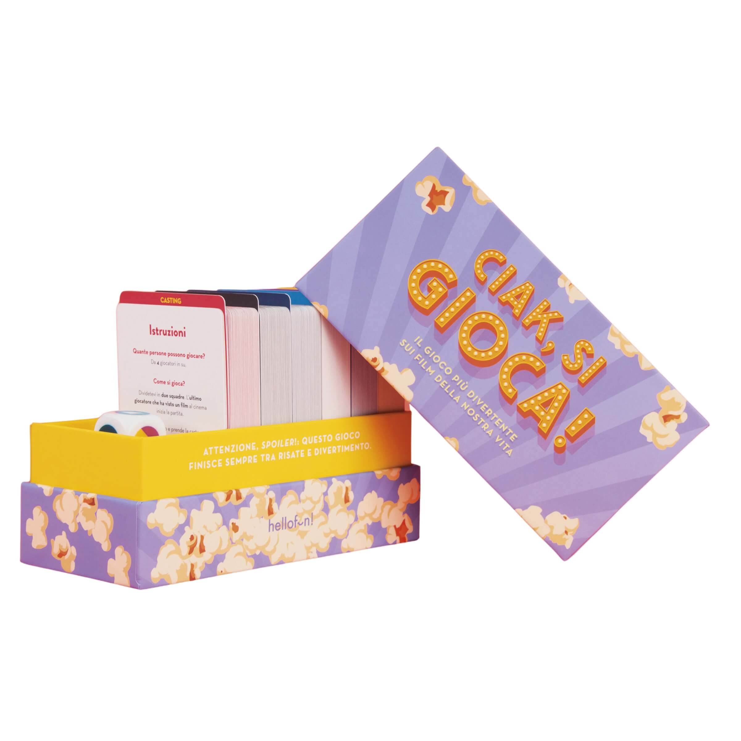 Il gioco di carte Ciak si gioca di Hellofun è il compagno ideale per tutti gli amanti del cinema, ma anche per chi semplicemente desidera divertirsi con famiglia e amici. Un gioco coinvolgente che mette alla prova la creatività, la memoria e l'interpretazione, invitando i partecipanti a imitare scene celebri, recitare battute iconiche, evitare spoiler e dare il massimo con le colonne sonore più amate. Che siate cinefili appassionati o semplici spettatori occasionali, Ciak si gioca trasforma ogni incontro in un'esperienza unica e spassosa.• Contenuto Della Confezione: All'interno troverete 200 carte ricche di sfide divertenti, un dado personalizzato che aggiunge imprevedibilità a ogni turno e un regolamento semplice da seguire che consente di iniziare a giocare in pochi minuti. I materiali sono di alta qualità, pensati per resistere a tante partite piene di entusiasmo.• Modalità Di Gioco: Ogni carta propone una sfida diversa, come imitare una scena famosa, recitare una battuta mitica senza sbagliare, evitare spoiler raccontando solo il necessario oppure interpretare colonne sonore indimenticabili. Le sfide sono pensate per stimolare l'inventiva e creare situazioni esilaranti in cui ogni partecipante può esprimere il proprio talento in modo spontaneo.• Età Consigliata: Adatto dai 14 anni in su, Ciak si gioca è pensato per ragazzi, giovani e adulti che amano il cinema e il divertimento senza barriere. Non serve essere esperti: basta la voglia di mettersi in gioco e tanta fantasia.• Durata Media Della Partita: Una partita dura in media circa 30 minuti, rendendolo perfetto sia per una sfida rapida sia per animare lunghe serate di gioco con più sessioni consecutive.• Numero Di Giocatori: Consigliato per gruppi da almeno 4 persone, ma facilmente adattabile anche a numeri più grandi suddividendo i partecipanti in squadre, per un'esperienza ancora più coinvolgente e dinamica.Ciak si gioca di Hellofun è molto più di un semplice gioco: è un'occasione per liberare la propria creatività, perdersi nelle emozioni che il cinema ci regala e, soprattutto, per condividere momenti autentici con le persone care. In ogni turno si ride, si ricorda e si improvvisa, vivendo un'esperienza che unisce fantasia, cultura pop e tanto divertimento. Non importa il livello di preparazione cinematografica: quello che conta è lasciarsi andare e vivere l'emozione del set... direttamente a casa propria.Avvertenze: Prodotto non adatto ai bambini di età inferiore ai 3 anni. Contiene piccole parti che potrebbero causare rischi di soffocamento se ingerite o inalate. Conservare l’imballo per qualsiasi informazione e consultazione futura.