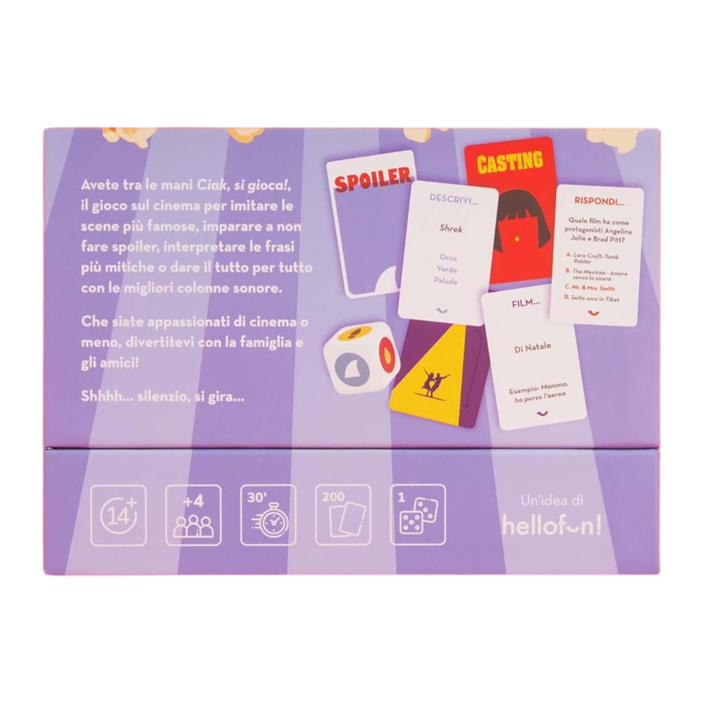 Il gioco di carte Ciak si gioca di Hellofun è il compagno ideale per tutti gli amanti del cinema, ma anche per chi semplicemente desidera divertirsi con famiglia e amici. Un gioco coinvolgente che mette alla prova la creatività, la memoria e l'interpretazione, invitando i partecipanti a imitare scene celebri, recitare battute iconiche, evitare spoiler e dare il massimo con le colonne sonore più amate. Che siate cinefili appassionati o semplici spettatori occasionali, Ciak si gioca trasforma ogni incontro in un'esperienza unica e spassosa.• Contenuto Della Confezione: All'interno troverete 200 carte ricche di sfide divertenti, un dado personalizzato che aggiunge imprevedibilità a ogni turno e un regolamento semplice da seguire che consente di iniziare a giocare in pochi minuti. I materiali sono di alta qualità, pensati per resistere a tante partite piene di entusiasmo.• Modalità Di Gioco: Ogni carta propone una sfida diversa, come imitare una scena famosa, recitare una battuta mitica senza sbagliare, evitare spoiler raccontando solo il necessario oppure interpretare colonne sonore indimenticabili. Le sfide sono pensate per stimolare l'inventiva e creare situazioni esilaranti in cui ogni partecipante può esprimere il proprio talento in modo spontaneo.• Età Consigliata: Adatto dai 14 anni in su, Ciak si gioca è pensato per ragazzi, giovani e adulti che amano il cinema e il divertimento senza barriere. Non serve essere esperti: basta la voglia di mettersi in gioco e tanta fantasia.• Durata Media Della Partita: Una partita dura in media circa 30 minuti, rendendolo perfetto sia per una sfida rapida sia per animare lunghe serate di gioco con più sessioni consecutive.• Numero Di Giocatori: Consigliato per gruppi da almeno 4 persone, ma facilmente adattabile anche a numeri più grandi suddividendo i partecipanti in squadre, per un'esperienza ancora più coinvolgente e dinamica.Ciak si gioca di Hellofun è molto più di un semplice gioco: è un'occasione per liberare la propria creatività, perdersi nelle emozioni che il cinema ci regala e, soprattutto, per condividere momenti autentici con le persone care. In ogni turno si ride, si ricorda e si improvvisa, vivendo un'esperienza che unisce fantasia, cultura pop e tanto divertimento. Non importa il livello di preparazione cinematografica: quello che conta è lasciarsi andare e vivere l'emozione del set... direttamente a casa propria.Avvertenze: Prodotto non adatto ai bambini di età inferiore ai 3 anni. Contiene piccole parti che potrebbero causare rischi di soffocamento se ingerite o inalate. Conservare l’imballo per qualsiasi informazione e consultazione futura.