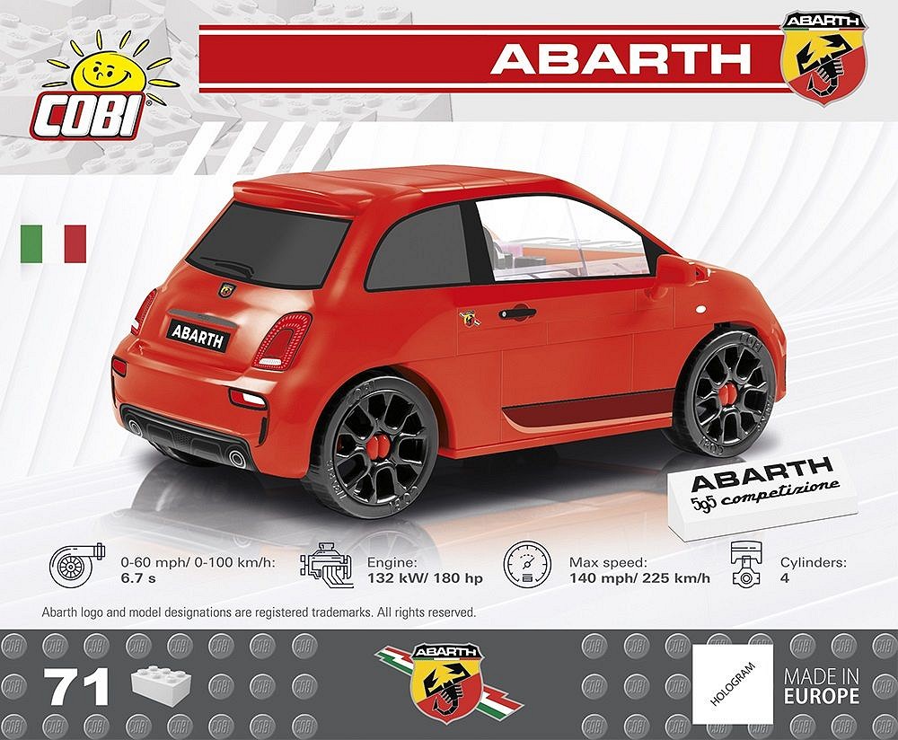 L'Abarth è una versione più sportiva della famosissima FIAT 500, lanciata nel 2007. Stile moderno ed estremamente alla moda, attira l'attenzione e la distinzione nell'industria automobilistica. Il modello con licenza di alta qualità realizzato in scala 1:35 riflette fedelmente l'originale. Grazie a 71 elementi è possibile apportare piccole modifiche e alterazioni al veicolo. I mattoncini hanno stampe durevoli su di essi che non si consumano nemmeno durante il gioco intenso. durante il gioco. Il set include un blocco con il nome del modello stampato su di esso. Soddisferà sia i collezionisti adulti che gli appassionati di motori così come i bambini.• Dimensioni del modello (lunghezza x altezza): 10,5 cm (4.1") x 6,5 cm (2.55") x 4,5 cm (1.77")• Scala: 1:35• Numero di blocchi: 71• Fascia di età: 7+