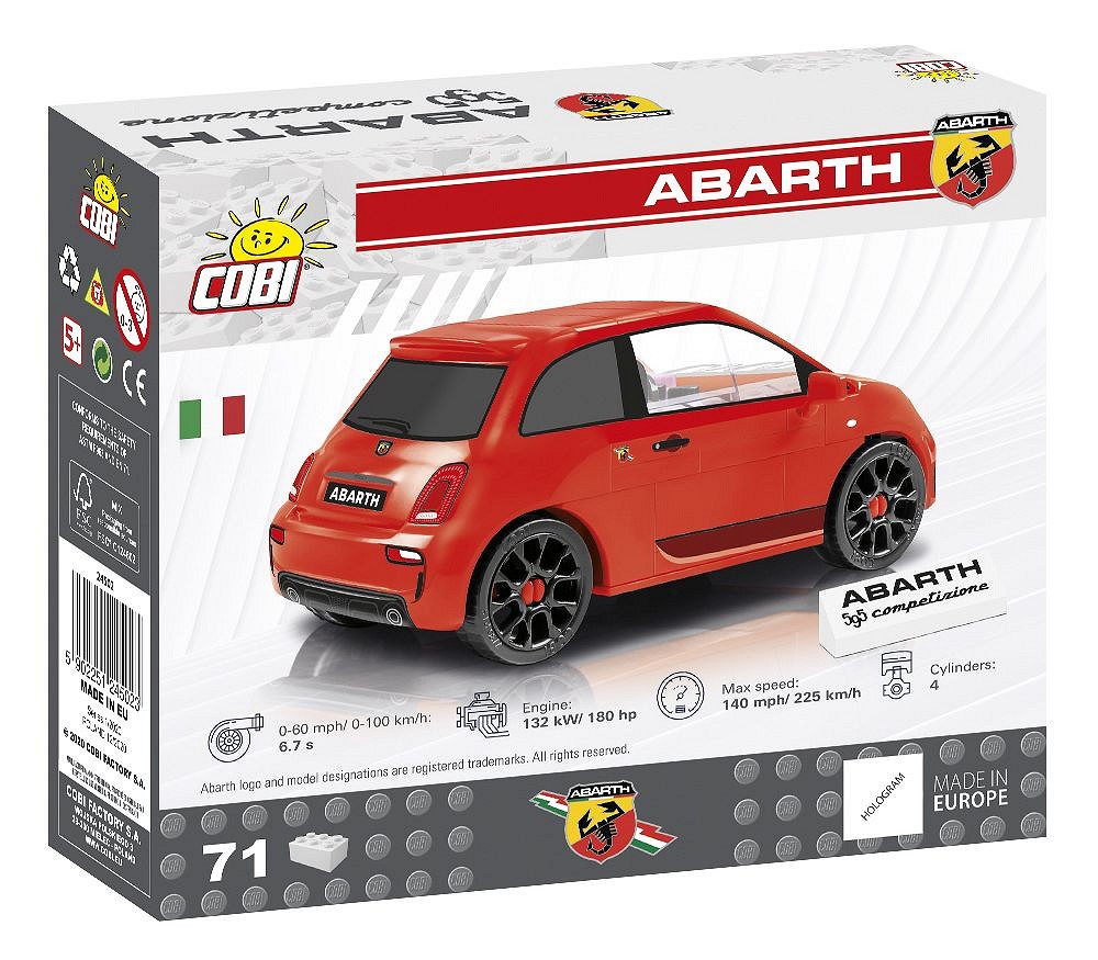 L'Abarth è una versione più sportiva della famosissima FIAT 500, lanciata nel 2007. Stile moderno ed estremamente alla moda, attira l'attenzione e la distinzione nell'industria automobilistica. Il modello con licenza di alta qualità realizzato in scala 1:35 riflette fedelmente l'originale. Grazie a 71 elementi è possibile apportare piccole modifiche e alterazioni al veicolo. I mattoncini hanno stampe durevoli su di essi che non si consumano nemmeno durante il gioco intenso. durante il gioco. Il set include un blocco con il nome del modello stampato su di esso. Soddisferà sia i collezionisti adulti che gli appassionati di motori così come i bambini.• Dimensioni del modello (lunghezza x altezza): 10,5 cm (4.1") x 6,5 cm (2.55") x 4,5 cm (1.77")• Scala: 1:35• Numero di blocchi: 71• Fascia di età: 7+