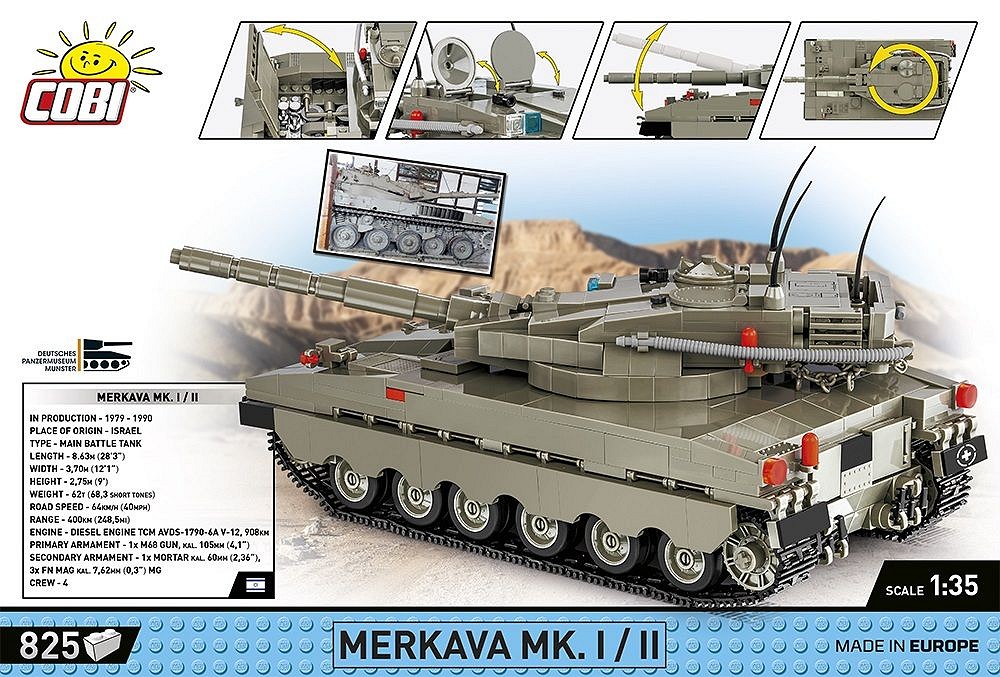 Merkava Mc. I/II è stato riprodotto fedelmente da 825 mattoncini COBI e riflette realisticamente l'aspetto della sua ispirazione museale. Elementi mobili come la torretta e il barile del carro armato, ruote e cingoli girevoli e portelli apribili permettono a tutti gli appassionati di blocchi e militari di divertirsi con questo modello. E' stato ricreato anche il motore del serbatoio, visionabile aprendo lo sportello di servizio. Grazie alle istruzioni intuitive, la costruzione è semplice ed emozionante. Ogni adulto appassionato di storia e tecnologia militare sarà sicuramente felice di aggiungere questo modello alla propria collezione. Grazie alla scala di modellizzazione 1:35, il carro armato si adatta agli altri veicoli della serie Armed Forces e si abbinerà perfettamente al Leopard 2A4, Leopard 2A5 e Abrams.In collaborazione con il Deutsches Panzermuseum Munster, abbiamo preparato un modello del Merkava Mk. I/II. Il Merkava è stato il primo carro armato da battaglia progettato e prodotto in Israele. La produzione in serie è iniziata nel 1979. Da allora sono state create quattro generazioni. Il carro armato è utilizzato esclusivamente dalle forze di difesa israeliane ed è stato coinvolto in tutti i conflitti e le operazioni militari avvenuti dopo la guerra dello Yom Kippur che hanno coinvolto lo Stato di Israele.Il serbatoio è stato progettato secondo requisiti IDF molto specifici. Soprattutto, fornisce un'ottima protezione all'equipaggio di un carro armato, cosa estremamente preziosa per Israele. Il motore si trova nella parte anteriore ed è facilmente accessibile e fornisce una protezione aggiuntiva per l'equipaggio. La torretta e il compartimento di combattimento si trovano nella parte posteriore del carro armato. La torretta è a forma di cuneo e lo scafo è a basso profilo, il che rende più semplice ridurre al minimo i danni. L'elevata potenza di fuoco è fornita dal cannone M68 migliorato da 105 mm. Il vano munizioni vuoto può consentire anche il trasporto di truppe. Il carro armato Merkava II era dotato di armatura rinforzata, schermi laterali e un migliore sistema di controllo del fuoco. I carri armati Merkava II sono stati finalmente sostituiti con la 3a e 4a generazione nel 2021.• 825 Pezzi• Prodotto nell'UE da un'azienda con oltre 20 anni di tradizione.• I blocchi soddisfano gli standard di sicurezza dei prodotti per bambini.• Pienamente compatibile con altre marche di blocchi da costruzione.• I blocchi con stampe non si graffiano, non imbrattano e non sbiadiscono durante il gioco o sotto l'influenza della temperatura.• Istruzioni chiare e intuitive basate su illustrazioni e indicazioni passo passo.• Modello sotto licenza originale del Deutsches Panzermuseum Munster.• Fascia d'età: 6+• Scala: 1:35