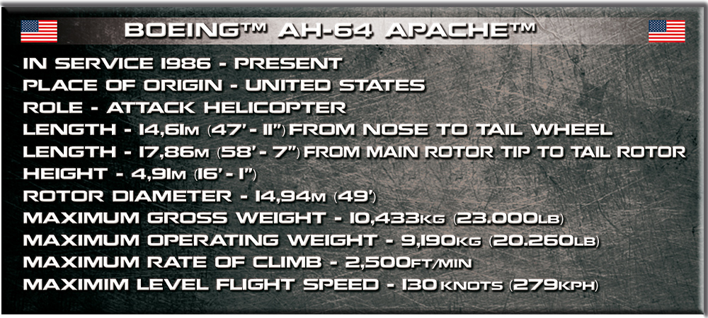 Il famoso Apache è un elicottero d'attacco tattico dell'esercito americano progettato per combattere armi corazzate e supportare unità di terra. È stato progettato come una macchina durevole in grado di funzionare in tutte le condizioni atmosferiche, indipendentemente dall'ora del giorno o dal luogo. È stato continuamente prodotto e modernizzato dagli anni '80. Il suo design eccellente e moderno e le sue ottime proprietà hanno reso le versioni da esportazione di grande interesse in altri paesi in tutto il mondo.