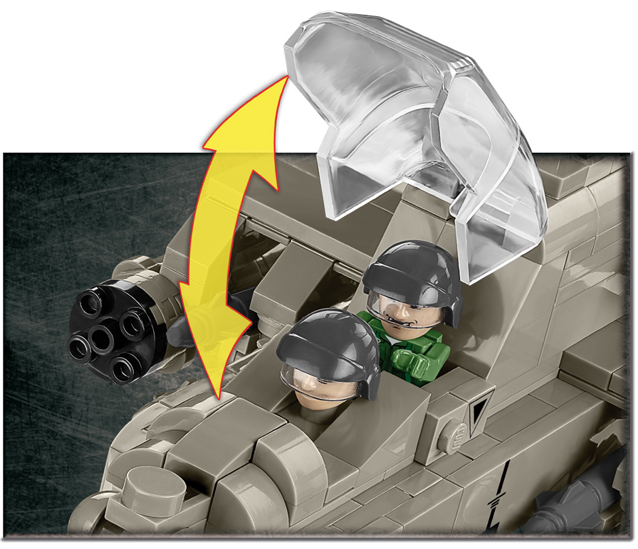 Con questo kit di elementi costitutivi COBI puoi costruire un elicottero americano AH-64 Apache estremamente preciso in scala 1:48. Il modello è stato rivestito con stampe di alta qualità che non si consumano nemmeno durante il gioco intenso. Le stampe imitano la verniciatura del veicolo con i colori degli Stati Uniti e imitano i dettagli dell'elicottero. L'Apache è dotato di eliche rotanti e cabina di pilotaggio apribile. Sono inclusi anche due personaggi pilota e un espositore con targhetta con il nome.