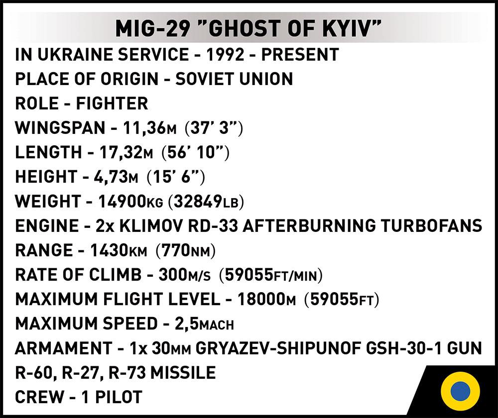 Esplora l'epopea aerea con il MiG-29 "Ghost of Kyiv" della collezione COBI Armed Force, un'edizione straordinaria in scala 1:48 che cattura la potenza e la grinta di questo iconico caccia russo. Con 600 pezzi di alta qualità, questa replica offre un'esperienza di costruzione coinvolgente, arricchita da dettagli unici e significativi.