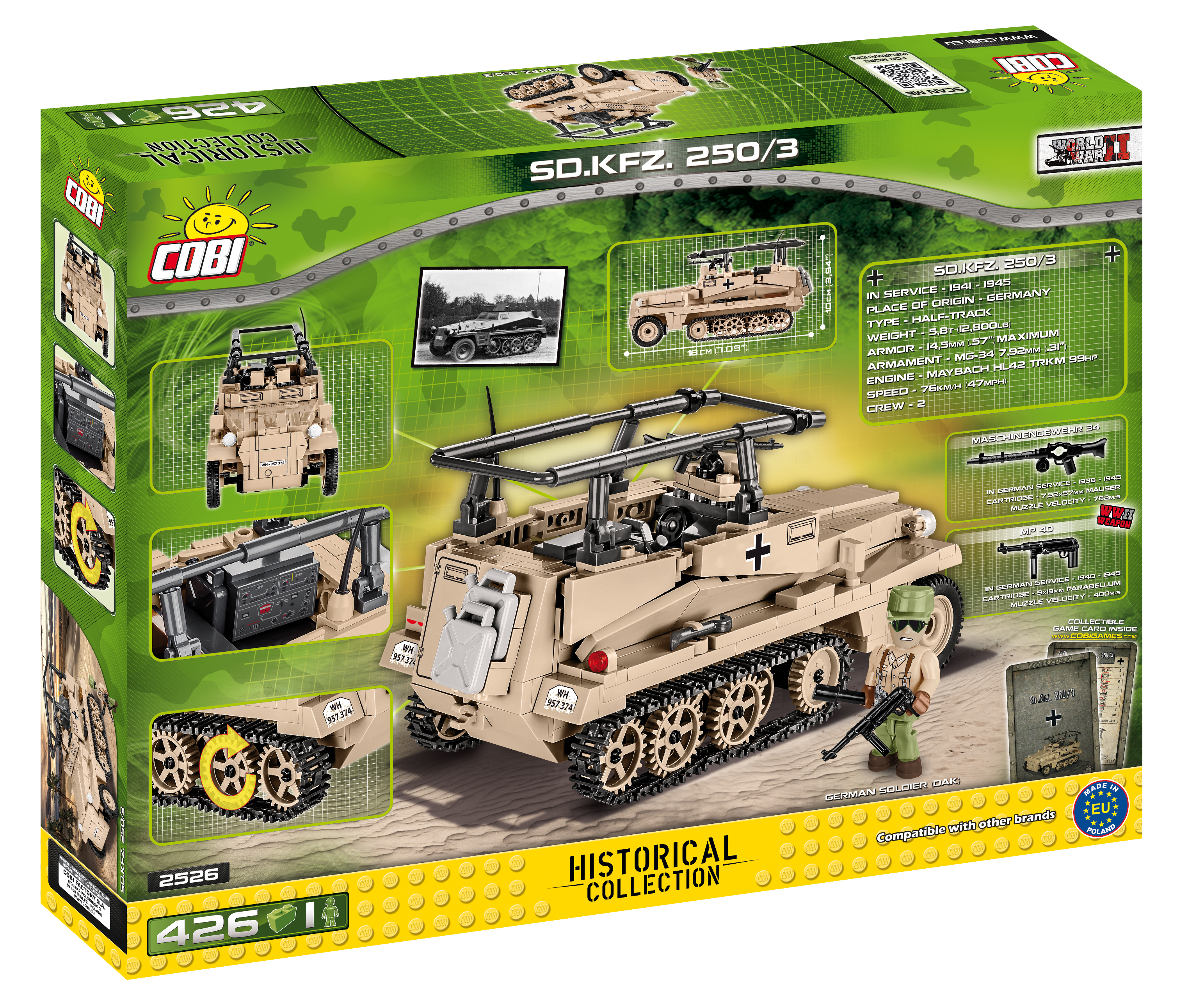 Il Sd.Kfz. 250 è stato un veicolo corazzato leggero tedesco utilizzato durante la Seconda Guerra Mondiale. Nella designazione "250/3", il numero "3" indica la versione specifica con funzioni di comunicazione.Ecco alcune caratteristiche chiave del Sd.Kfz. 250/3:Ruolo: Il Sd.Kfz. 250/3 era principalmente utilizzato come veicolo corazzato da riconoscimento e comando. La sua configurazione specifica, la "3", indicava che era attrezzato per funzioni di comunicazione e comando.Equipaggio: Era progettato per trasportare un piccolo equipaggio, spesso composto da personale di comando e comunicazioni.Design: Il veicolo aveva una configurazione a ruote motrici anteriori e una torretta corazzata. La parte posteriore del veicolo conteneva l'equipaggio e l'equipaggiamento necessario per le operazioni di comando e comunicazione.Mobilità: Il Sd.Kfz. 250/3 era noto per la sua buona mobilità, che gli permetteva di operare in vari tipi di terreno. La sua struttura leggera lo rendeva adatto per esplorare e comunicare in ambienti più difficili.Partecipazione alla Guerra: Questo veicolo corazzato è stato utilizzato attivamente dalla Germania nazista durante la Seconda Guerra Mondiale, partecipando a varie campagne militari.Varianti: La famiglia Sd.Kfz. 250 includono diverse varianti, ognuna progettata per scopi specifici. La versione "3" si distingue per la sua funzione di comando e comunicazione.Il Sd.Kfz. 250/3 rappresenta uno dei numerosi veicoli corazzati utilizzati dalla Germania durante la Seconda Guerra Mondiale e riflette la diversificazione delle forze corazzate tedesche per soddisfare esigenze specifiche sul campo di battaglia.Caratteristiche Principali:• 426 pezzi: con un totale di 426 pezzi, questo kit di costruzione offre una sfida coinvolgente, ideale per gli appassionati di storia e costruzione.• Dimensioni realistiche: con una lunghezza di 18 cm, larghezza di 8 cm e un'altezza di 10 cm, la replica Sd.Kfz. 250/3 è un capolavoro compatto che cattura la natura agile di questo veicolo corazzato.• Dettagli Fedeli: Ogni pezzo del kit è progettato con precisione per catturare gli intricati dettagli del Sd.Kfz. 250/3, dal suo design a ruote motrici alla caratteristica torretta corazzata.• Esperienza di Costruzione Immersiva: Le parti mobili consentono di personalizzare la posizione del veicolo, offrendo un'esperienza di costruzione interattiva e coinvolgente.• Compatibile con Altre Costruzioni: Totalmente compatibile con altre marche di costruzioni, questo kit si integra facilmente nella tua collezione esistente.• Dimensioni Accessibili: Con le sue dimensioni accessibili, il Sd.Kfz. 250/3 è perfetto per l'esposizione su scrivanie, mensole o come pezzo centrale nella tua collezione di veicoli storici.