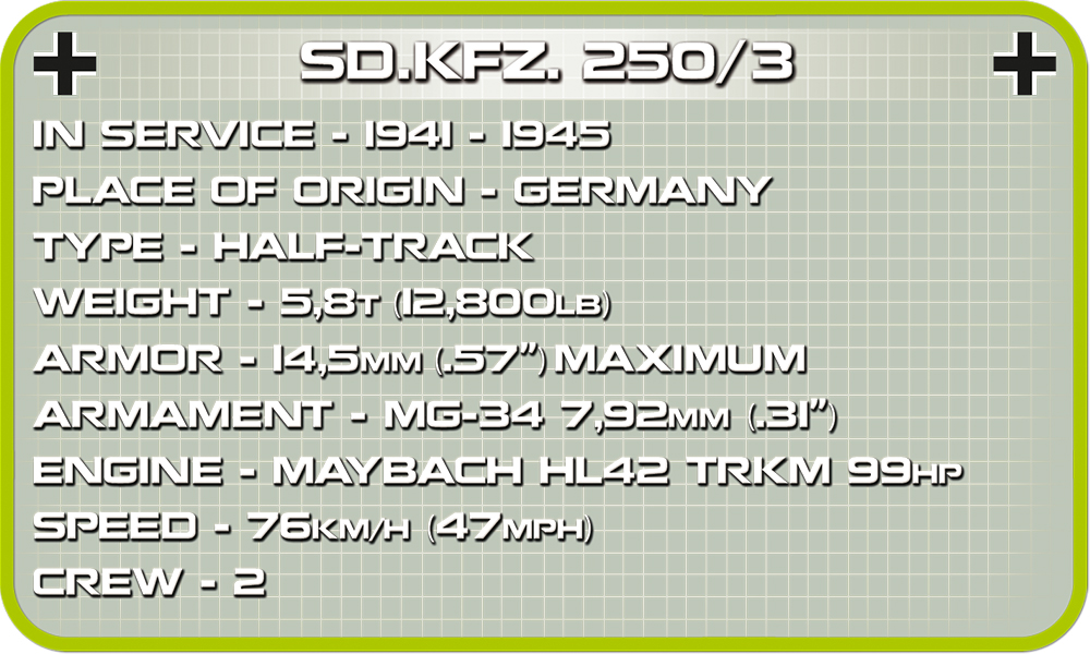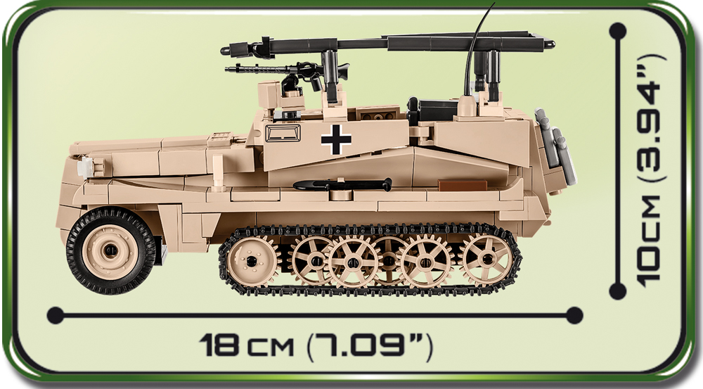 Il Sd.Kfz. 250 è stato un veicolo corazzato leggero tedesco utilizzato durante la Seconda Guerra Mondiale. Nella designazione "250/3", il numero "3" indica la versione specifica con funzioni di comunicazione.Ecco alcune caratteristiche chiave del Sd.Kfz. 250/3:Ruolo: Il Sd.Kfz. 250/3 era principalmente utilizzato come veicolo corazzato da riconoscimento e comando. La sua configurazione specifica, la "3", indicava che era attrezzato per funzioni di comunicazione e comando.Equipaggio: Era progettato per trasportare un piccolo equipaggio, spesso composto da personale di comando e comunicazioni.Design: Il veicolo aveva una configurazione a ruote motrici anteriori e una torretta corazzata. La parte posteriore del veicolo conteneva l'equipaggio e l'equipaggiamento necessario per le operazioni di comando e comunicazione.Mobilità: Il Sd.Kfz. 250/3 era noto per la sua buona mobilità, che gli permetteva di operare in vari tipi di terreno. La sua struttura leggera lo rendeva adatto per esplorare e comunicare in ambienti più difficili.Partecipazione alla Guerra: Questo veicolo corazzato è stato utilizzato attivamente dalla Germania nazista durante la Seconda Guerra Mondiale, partecipando a varie campagne militari.Varianti: La famiglia Sd.Kfz. 250 includono diverse varianti, ognuna progettata per scopi specifici. La versione "3" si distingue per la sua funzione di comando e comunicazione.Il Sd.Kfz. 250/3 rappresenta uno dei numerosi veicoli corazzati utilizzati dalla Germania durante la Seconda Guerra Mondiale e riflette la diversificazione delle forze corazzate tedesche per soddisfare esigenze specifiche sul campo di battaglia.Caratteristiche Principali:• 426 pezzi: con un totale di 426 pezzi, questo kit di costruzione offre una sfida coinvolgente, ideale per gli appassionati di storia e costruzione.• Dimensioni realistiche: con una lunghezza di 18 cm, larghezza di 8 cm e un'altezza di 10 cm, la replica Sd.Kfz. 250/3 è un capolavoro compatto che cattura la natura agile di questo veicolo corazzato.• Dettagli Fedeli: Ogni pezzo del kit è progettato con precisione per catturare gli intricati dettagli del Sd.Kfz. 250/3, dal suo design a ruote motrici alla caratteristica torretta corazzata.• Esperienza di Costruzione Immersiva: Le parti mobili consentono di personalizzare la posizione del veicolo, offrendo un'esperienza di costruzione interattiva e coinvolgente.• Compatibile con Altre Costruzioni: Totalmente compatibile con altre marche di costruzioni, questo kit si integra facilmente nella tua collezione esistente.• Dimensioni Accessibili: Con le sue dimensioni accessibili, il Sd.Kfz. 250/3 è perfetto per l'esposizione su scrivanie, mensole o come pezzo centrale nella tua collezione di veicoli storici.