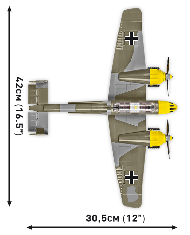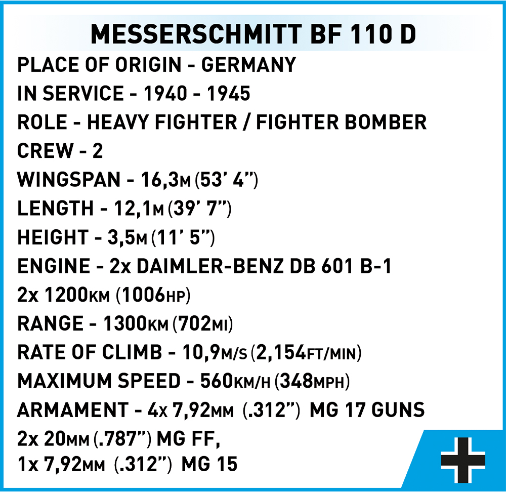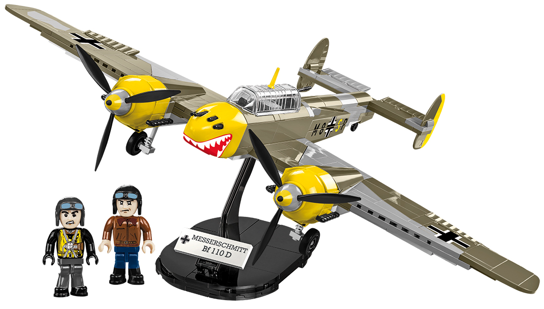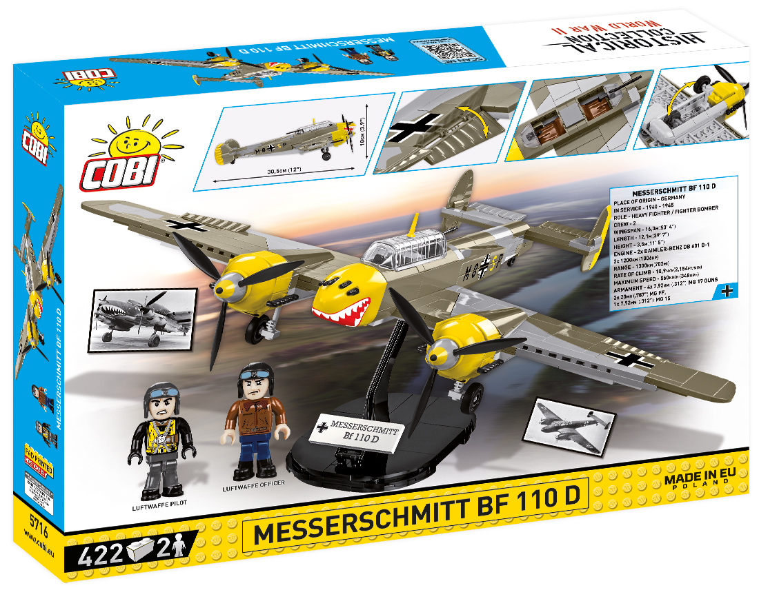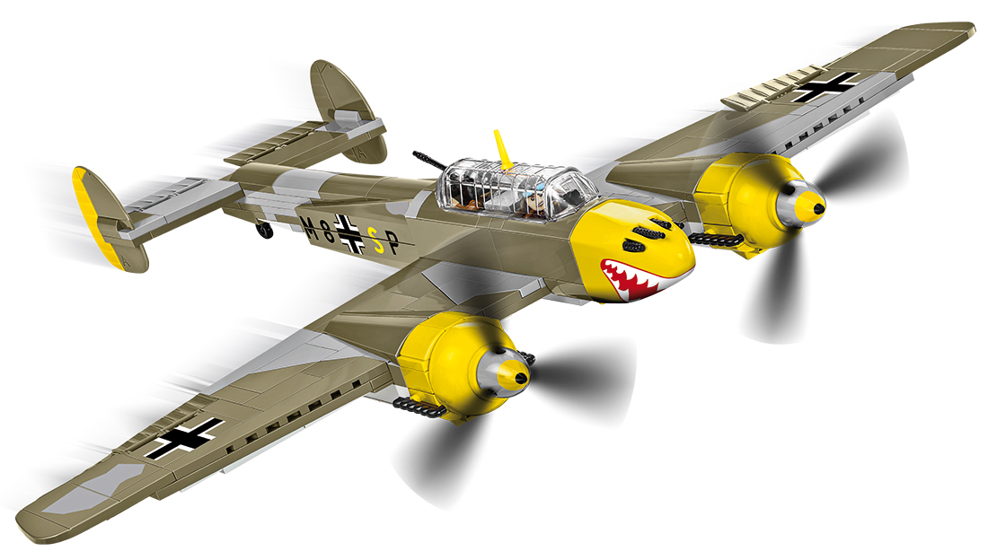 Il BF 110D è stato un cacciabombardiere bimotore di costruzione tedesca molto popolare durante la Seconda Guerra Mondiale. Prodotto tra il 1938 e il 1945, ebbe diverse versioni. A partire dalla versione B, era equipaggiato di serie con 4 MG 17 e 2 x MG FF da 20 mm montate sulla parte anteriore del muso e una singola MG 15 montata su una postazione mobile all'estremità della fusoliera e gestita da un operatore radio. Fu utilizzato con successo durante le campagne di settembre e di Francia. In seguito il 110 assunse il ruolo di bombardiere.Il modello in blocchi COBI ha molti elementi mobili come le ruote rotanti con pneumatici di gomma, le eliche mobili e i flap. Nella cabina sono state inserite due figure di piloti a grandezza naturale. Il modello in mattoncini è stato prodotto con bellissime marcature tampografiche, utilizzate durante le operazioni nella campagna greca del Mediterraneo. I blocchi COBI sono ricoperti da stampe di alta qualità che non si graffiano e non sbiadiscono, anche durante l'uso intensivo. È un modello ideale per tutti gli appassionati di aviazione. Grazie alle proporzioni e ai dettagli fedelmente resi dell'aereo, il modello sarà perfetto come aggiunta a qualsiasi collezione di collezionisti giovani o adulti appassionati di storia e di aviazione. L'intero set è completato da un elegante espositore a blocchi e da una targhetta con il nome del modello.• 442 Pezzi.• Prodotto nell'UE da un'azienda con oltre 20 anni di tradizione.• Soddisfa gli standard di sicurezza per i prodotti per bambini.• Pienamente compatibile con le altre marche di blocchi da costruzione.• I blocchi con stampe non si graffiano e non sbiadiscono durante il gioco o sotto l'influenza della temperatura.• Istruzioni intuitive e di facile lettura, basate su illustrazioni e istruzioni passo-passo.100% stampe, senza adesivi.• Due figure raffiguranti un pilota tedesco e un paracadutista.• Una targhetta con il nome dell'aereo.