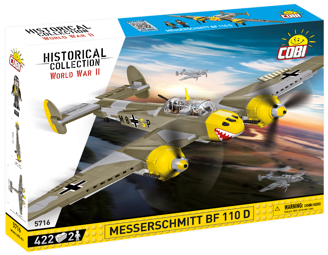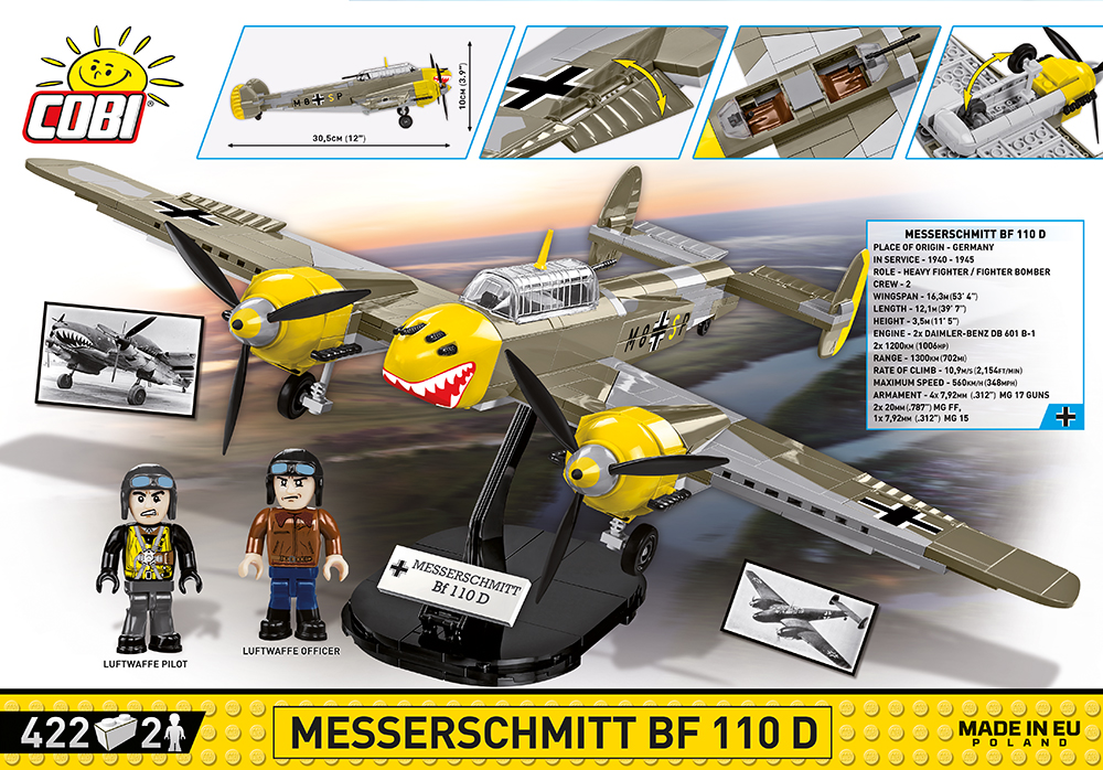 Il BF 110D è stato un cacciabombardiere bimotore di costruzione tedesca molto popolare durante la Seconda Guerra Mondiale. Prodotto tra il 1938 e il 1945, ebbe diverse versioni. A partire dalla versione B, era equipaggiato di serie con 4 MG 17 e 2 x MG FF da 20 mm montate sulla parte anteriore del muso e una singola MG 15 montata su una postazione mobile all'estremità della fusoliera e gestita da un operatore radio. Fu utilizzato con successo durante le campagne di settembre e di Francia. In seguito il 110 assunse il ruolo di bombardiere.Il modello in blocchi COBI ha molti elementi mobili come le ruote rotanti con pneumatici di gomma, le eliche mobili e i flap. Nella cabina sono state inserite due figure di piloti a grandezza naturale. Il modello in mattoncini è stato prodotto con bellissime marcature tampografiche, utilizzate durante le operazioni nella campagna greca del Mediterraneo. I blocchi COBI sono ricoperti da stampe di alta qualità che non si graffiano e non sbiadiscono, anche durante l'uso intensivo. È un modello ideale per tutti gli appassionati di aviazione. Grazie alle proporzioni e ai dettagli fedelmente resi dell'aereo, il modello sarà perfetto come aggiunta a qualsiasi collezione di collezionisti giovani o adulti appassionati di storia e di aviazione. L'intero set è completato da un elegante espositore a blocchi e da una targhetta con il nome del modello.• 442 Pezzi.• Prodotto nell'UE da un'azienda con oltre 20 anni di tradizione.• Soddisfa gli standard di sicurezza per i prodotti per bambini.• Pienamente compatibile con le altre marche di blocchi da costruzione.• I blocchi con stampe non si graffiano e non sbiadiscono durante il gioco o sotto l'influenza della temperatura.• Istruzioni intuitive e di facile lettura, basate su illustrazioni e istruzioni passo-passo.100% stampe, senza adesivi.• Due figure raffiguranti un pilota tedesco e un paracadutista.• Una targhetta con il nome dell'aereo.