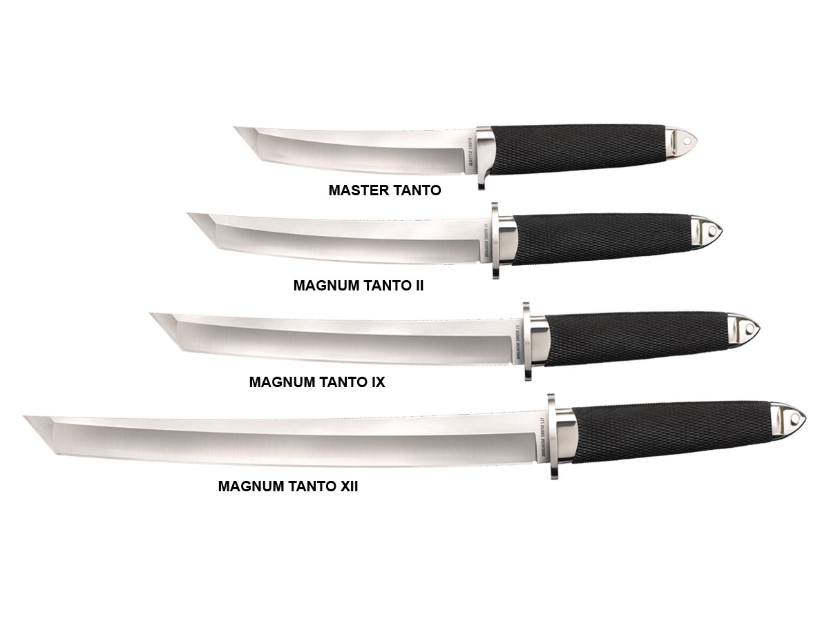 Cold Steel ha inventato e reso popolare questo stile di coltello nei primi anni '80 ed ha negli anni persuaso il pubblico, sia attraverso la pubblicità che le dimostrazioni dal vivo o videoregistrate, dei numerosi vantaggi del Tanto. Tutti i Tanto sono caratterizzati da una finitura satinata lucida profonda sui bordi smussati della lama e da una finitura a grana grossa a contrasto sui piani delle lame. Vengono realizzati con la famosa impugnatura ovale Kraton, materiale che non si incrina o non marcisce ed è immune alle intemperie del maltempo. La forma ovale fornisce una presa solida e resiste al rotolamento o alla torsione della mano in condizioni difficili. Il pomo conico in acciaio solido è un'altra importante caratteristica di Tanto che non dovrebbe essere ignorata. Lynn Thompson l'ha progettato per concentrare tutta la forza di un colpo schiacciante in una piccola area in modo che anche un colpo moderatamente potente possa essere straordinariamente efficace.
