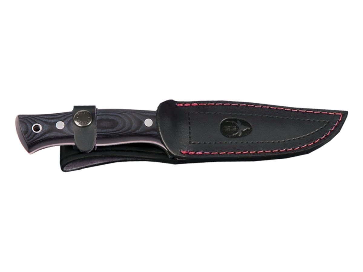 Il coltello Muela  POINTER 12R si presenta con una lama realizzata in acciaio MOVA (1.4116) e con il manico in una bellissima micarta nera/blu.  E'  accompagnato da un fodero in cuoio  di alta qualità .