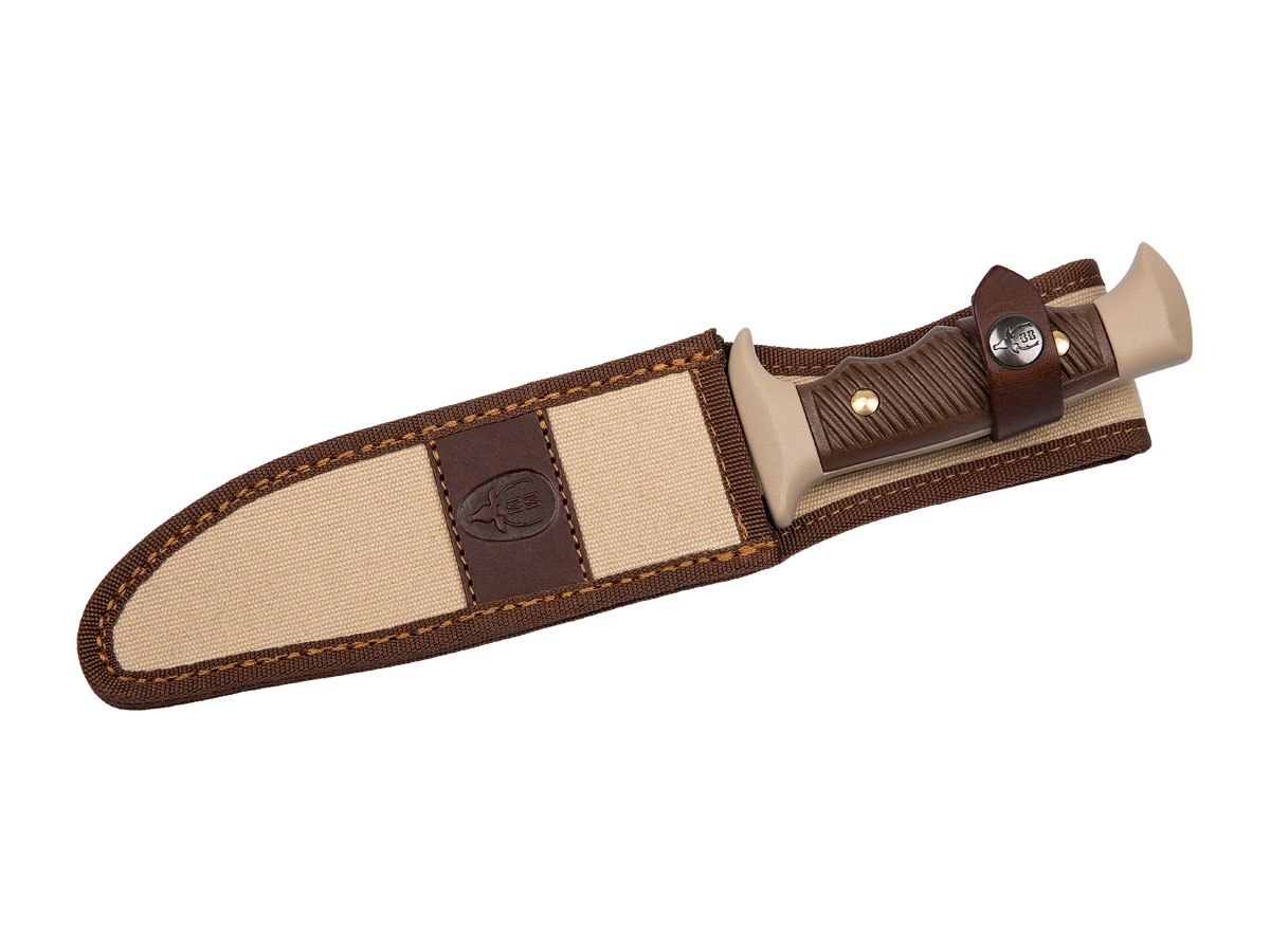 Coltello con acciaio Nitro 42, manico in zama laccato sabbia e guancette in ABS marrone.