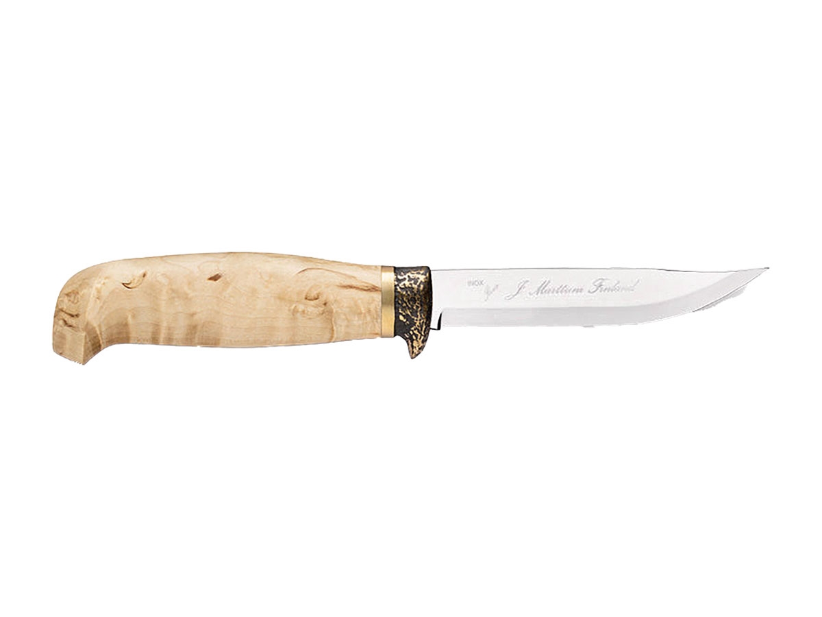 Il Lynx 134 combina caratteristiche pratiche con splendidi dettagli in bronzo. L'impugnatura è in betulla riccia cerata, mentre la protezione per le dita in bronzo aggiunge un tocco di lusso. La lama è realizzata in pratico acciaio inossidabile cromato. È incluso un fodero in pelle resistente e di bell'aspetto.