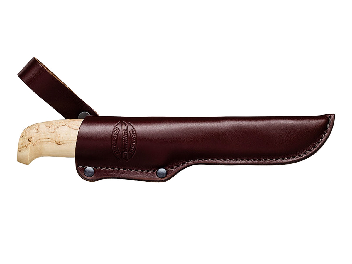 Il Lynx 134 combina caratteristiche pratiche con splendidi dettagli in bronzo. L'impugnatura è in betulla riccia cerata, mentre la protezione per le dita in bronzo aggiunge un tocco di lusso. La lama è realizzata in pratico acciaio inossidabile cromato. È incluso un fodero in pelle resistente e di bell'aspetto.