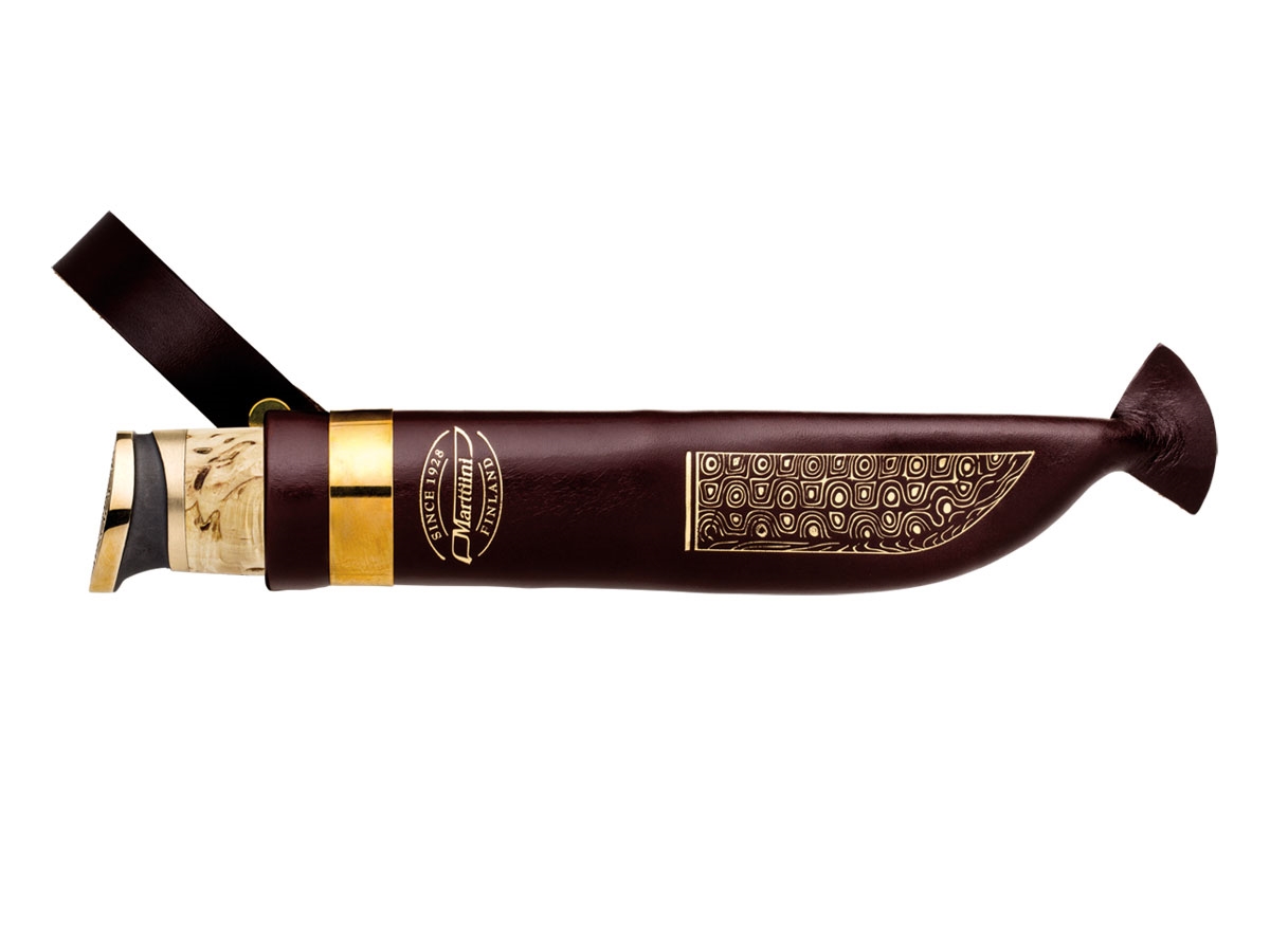 Il Marttiini Damasco è realizzato con una lama in acciaio inossidabile Damasco, dove, grazie a una speciale tecnologia, due diversi acciai di alta qualità vengono combinati in 120 strati. L'interstratificazione dei due acciai e la lavorazione altamente specializzata esaltano la splendida decorazione della lama. Il manico del coltello è in betulla finlandese riccia e le ghiere sono in bronzo fuso. Il bellissimo motivo della lama si ripete sulla ghiera all'estremità del manico. I coltelli Marttiini Damasco sono numerati in base all'anno di produzione, rendendo ogni coltello un pezzo da collezione unico.