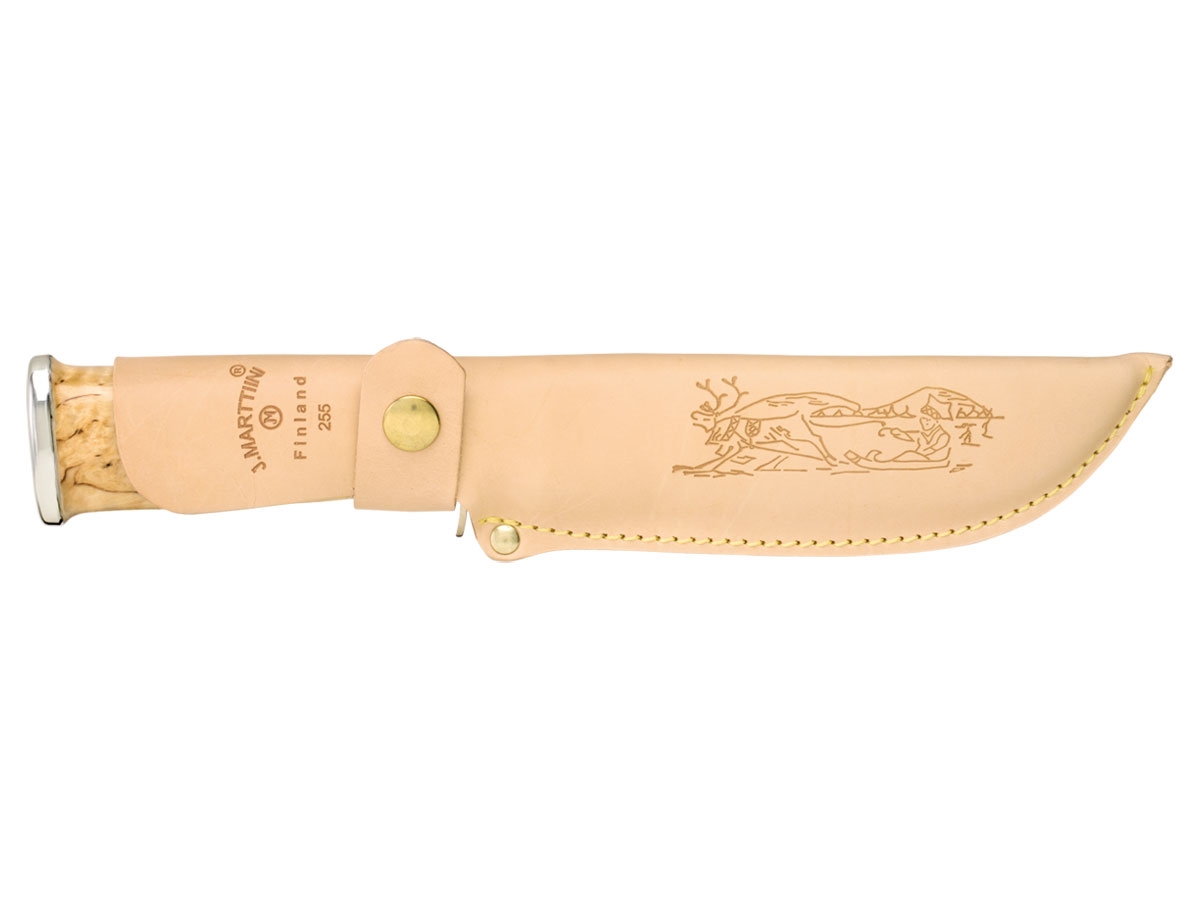 Il Lapp Knife 255 è un coltello tradizionale che include una protezione per le dita e quindi una maggiore sicurezza all'utilizzatore. Questo coltello lappone è un eccellente coltello multiuso, adatto sia per l'outdoor che per la caccia. La lama in acciaio inossidabile cromato e il fodero raffigurano temi tradizionali lapponi. Il fodero è inoltre dotato di una sicura chiusura a scatto.