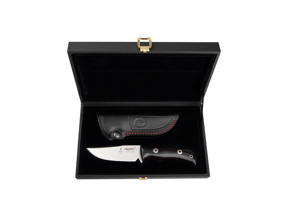 Questo Husky 11M.E è una variante più grande e più forte rispetto alle precedenti, per la produzione della quale sono stati utilizzati materiali selezionati. E' realizzato in un unico pezzo di acciaio inossidabile Sandvik 14C28 di alta qualità con una durezza di 57 - 61 HRC. Il manico è realizzato in micarta nera con finitura lucida ed è piacevolmente arrotondato con una protezione corta ed un foro per il cordino. Il coltello include un fodero in pelle nera con cuciture rosse ed un'elegante confezione regalo.
