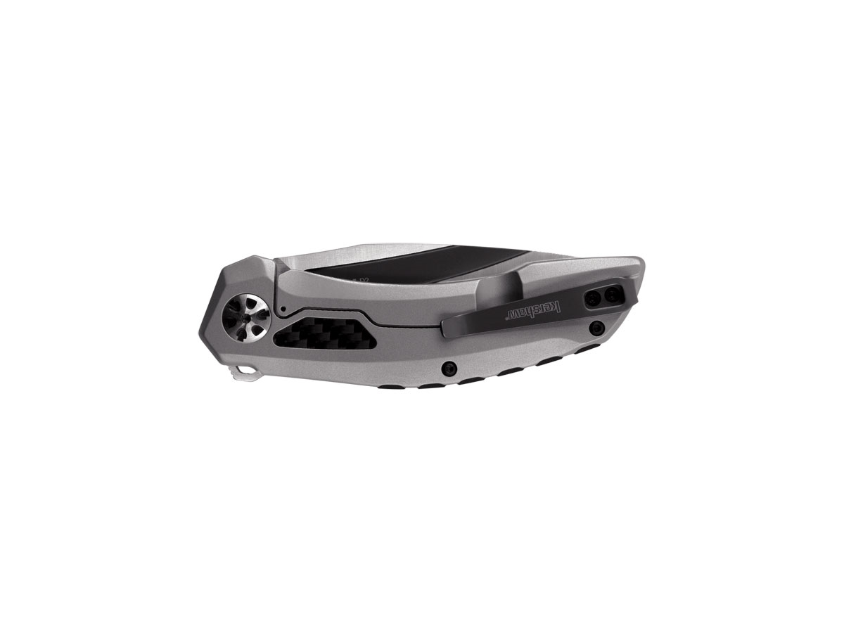 Ispirato alle linee del design aerospaziale, il Norad ha la lama drop point in acciaio D2 con una finitura bicolore: una cavità nella lama presenta un rivestimento in PVD grigio e il resto della lama è satinato . Gli inserti in fibra di carbonio nel manico in acciaio e un perno sovradimensionato e lucidato aggiungono un aspetto moderno, mentre un backspacer personalizzato con jimp rialzato offre una presa sicura.