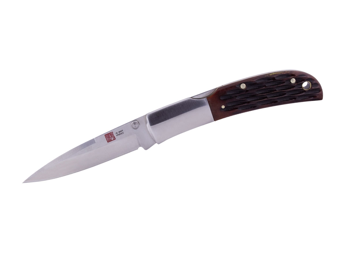 La collezione Classic Honey Jigged Bone presenta un design con chiusura frontale con rinforzo in acciaio e impugnatura in osso jigged naturale. La configurazione della lama è quella originale che si trova su tutti i coltelli della serie Classic di Al Mar. La lama in acciaio AUS-8 ha una finitura satinata e si affila facilmente fino al filo di un rasoio. Include una custodia in pelle finemente lavorata con impresso il logo AL MAR.