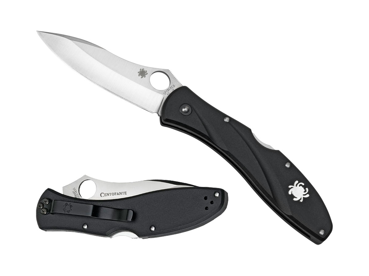 Il Centofante 3 ha un manico in FRN leggero con profilo sottile. Due canali sono solcati dal manico per una presa migliore e un inserto Spyderco argento Palladium è intarsiato nella sua superficie. La lama VG-10 ha una frantumazione cava e una fresa a cuneo con dentature non affilate (jimping) per mantenere il pollice fermo durante il taglio. Una clip da tasca in acciaio nero per il ribaltamento e il trasporto con la mano destra.
