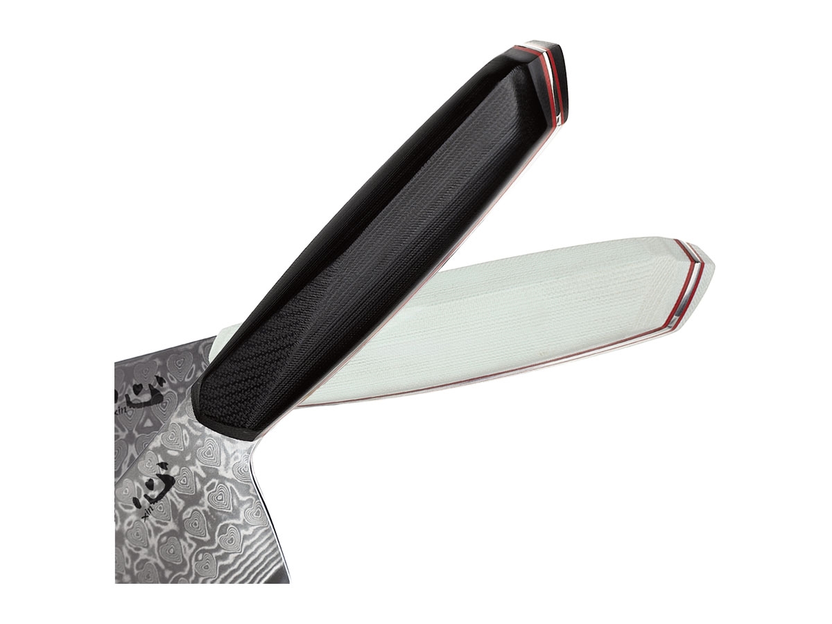 La lama presenta un acciaio damasco VG10 a 67 strati con 61±1 Rockwell, lucidato a specchio. In particolare, un motivo Damasco a forma di "cuore" dal design esclusivo viene applicato sulla lama, portando una sensazione nuova di zecca a tutti i fan di Damasco. L'impugnatura applica fibra-resina G10 con lucidatura a mano e la forma ergonomica dell'impugnatura massimizza il comfort, la presa e la manovrabilità.