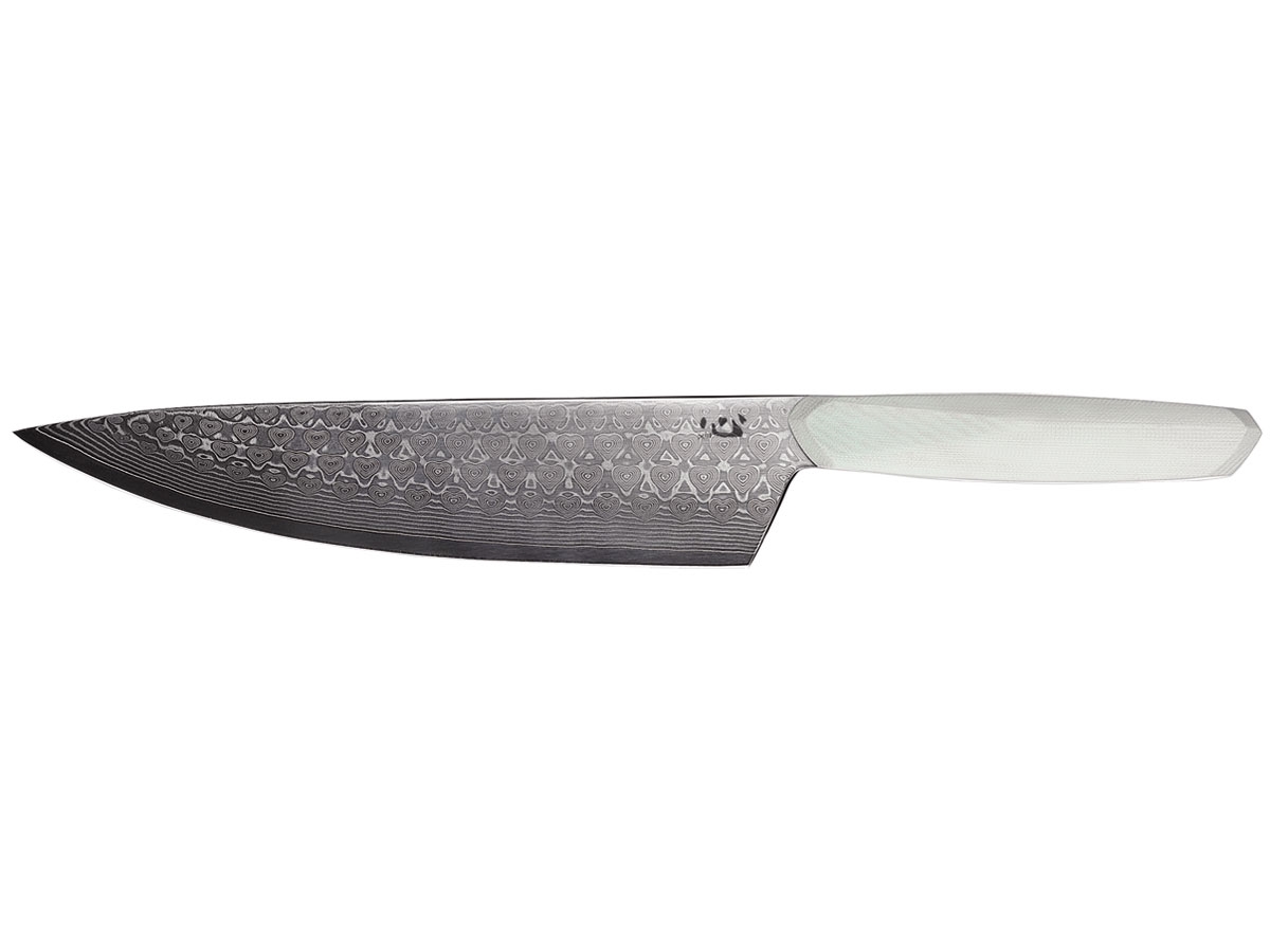 La lama presenta un acciaio damasco VG10 a 67 strati con 61±1 Rockwell, lucidato a specchio. In particolare, un motivo Damasco a forma di "cuore" dal design esclusivo viene applicato sulla lama, portando una sensazione nuova di zecca a tutti i fan di Damasco. L'impugnatura applica fibra-resina G10 con lucidatura a mano e la forma ergonomica dell'impugnatura massimizza il comfort, la presa e la manovrabilità.