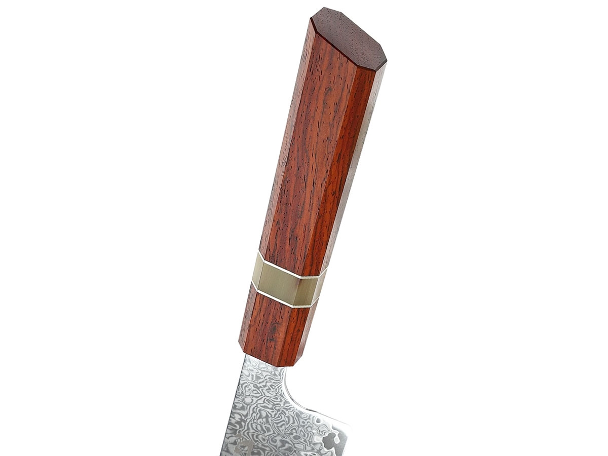 La lama presenta un acciaio damasco VG10 a 67 strati con 61±1 Rockwell e con motivo "a gocce di pioggia" ed ha una rifinitura lucidata a specchio. L'impugnatura dalla forma smussata e dritta applica legno di palissandro, corno di bufalo e nichel argento.