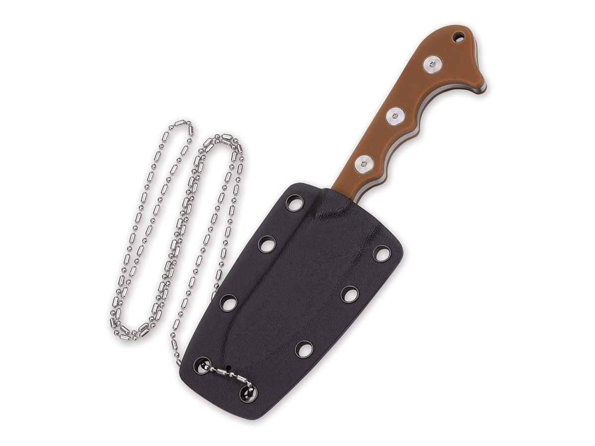 Il Neckmuk è un coltello da collo con una lama drop point in acciaio inossidabile D2 satinato. Il manico è in G10 ed ha un foro per la catena, così come il fodero in Kydex.
