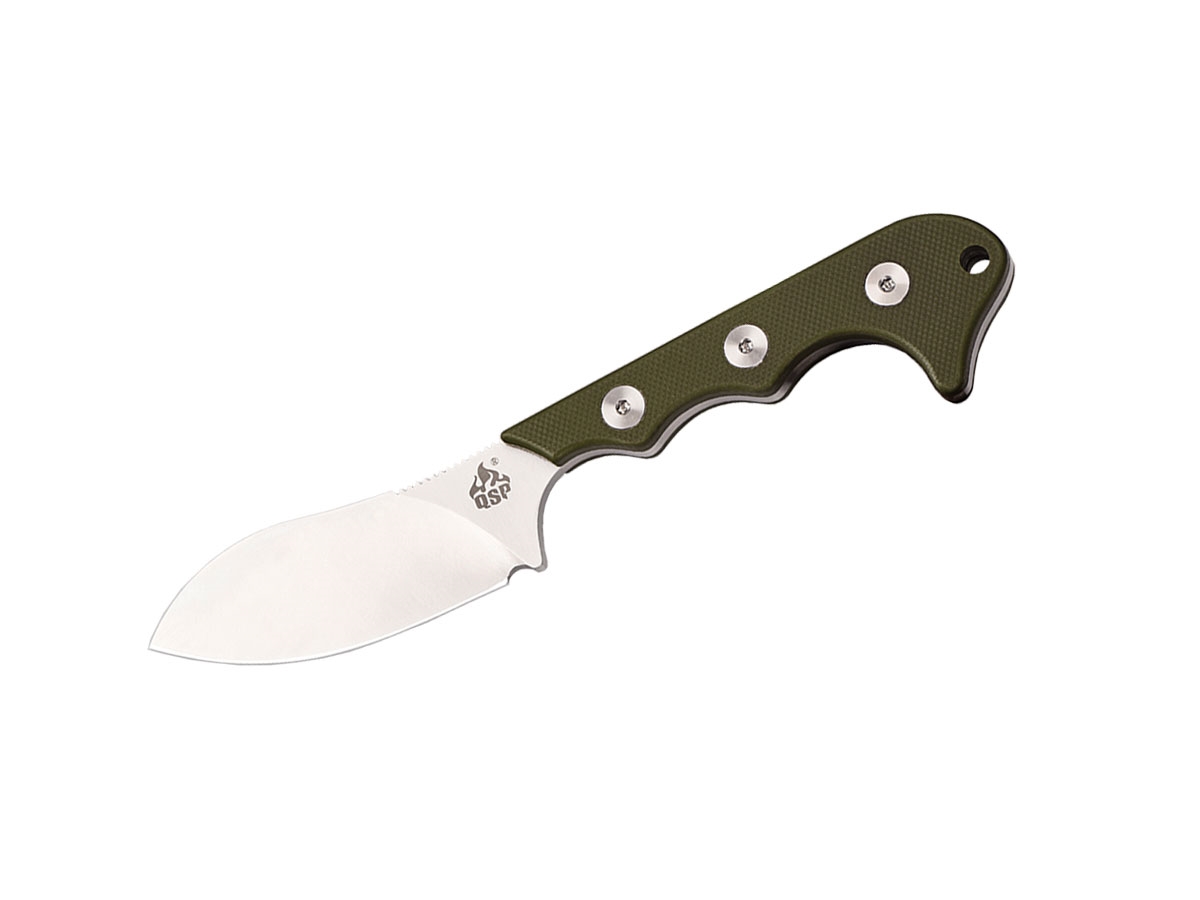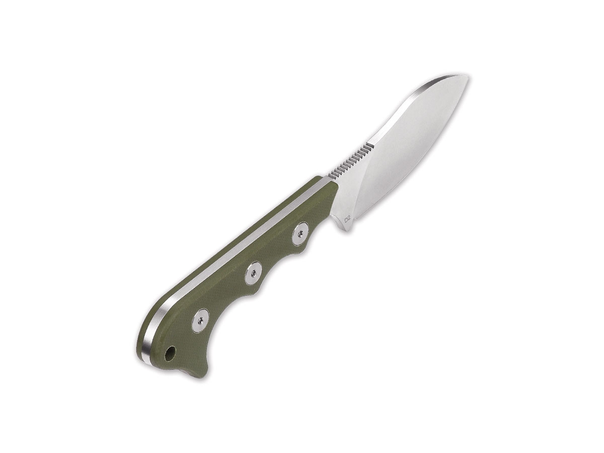 Il Neckmuk è un coltello da collo con una lama drop point in acciaio inossidabile D2 satinato. Il manico è in G10 ed ha un foro per la catena, così come il fodero in Kydex.