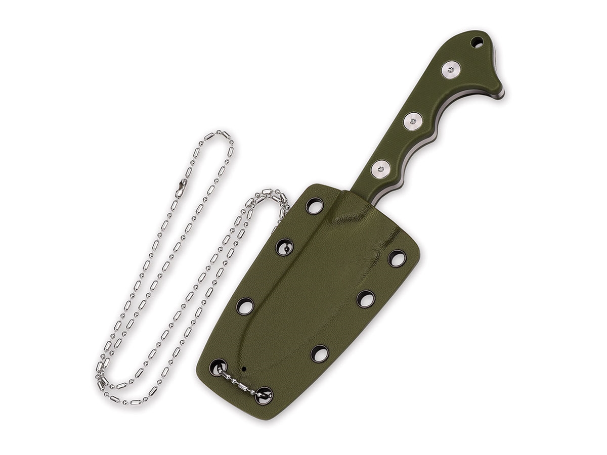 Il Neckmuk è un coltello da collo con una lama drop point in acciaio inossidabile D2 satinato. Il manico è in G10 ed ha un foro per la catena, così come il fodero in Kydex.