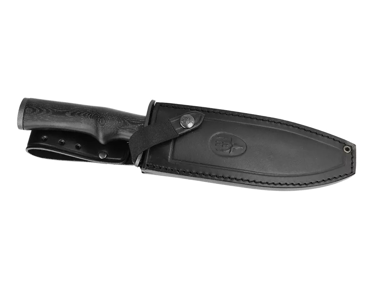 Il Parabellum 17N è un coltello grande e resistente destinato agli appassionati militari e di sopravvivenza. E' dotato di una lama lunga e massiccia di tipo Bowie in acciaio inox, perfettamente bilanciata, che fornisce un'enorme potenza di taglio. Il manico ha un profilo ergonomico ed è realizzzato in Micarta nera, che dona al coltello un tocco di leggerezza. Il fodero in pelle è di alta qualità.