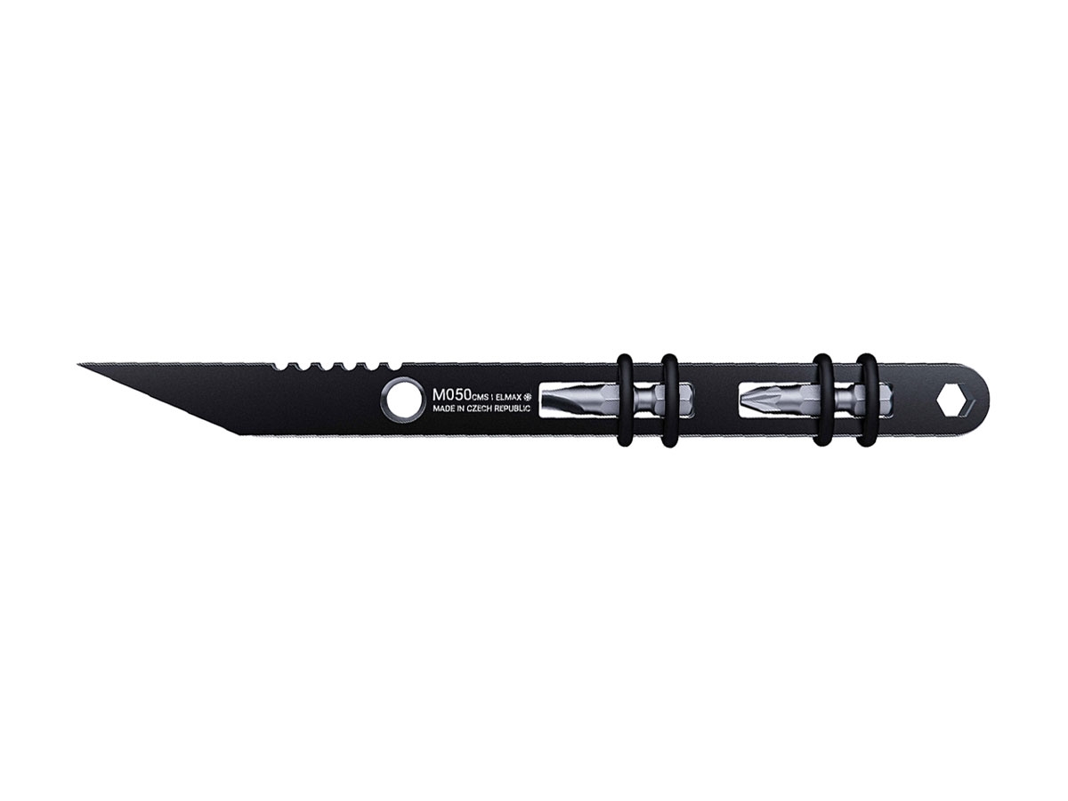 La lama è in acciaio Elmax, un acciaio inossidabile metallurgico delle polveri creato da Bohler-Uddenholm resistente alla corrosione grazie alla sua elevata percentuale di cromo. L'estremità dell'impugnatura presenta un'apertura esagonale per l'azionamento della punta esagonale standard da ¼". Con due scomparti nel manico, si possono portare più punte esagonali o qualsiasi altro oggetto. L'M050 viene fornito di serie con una clip molle fissata al fodero in Kydex e due punte esagonali nel manico.
