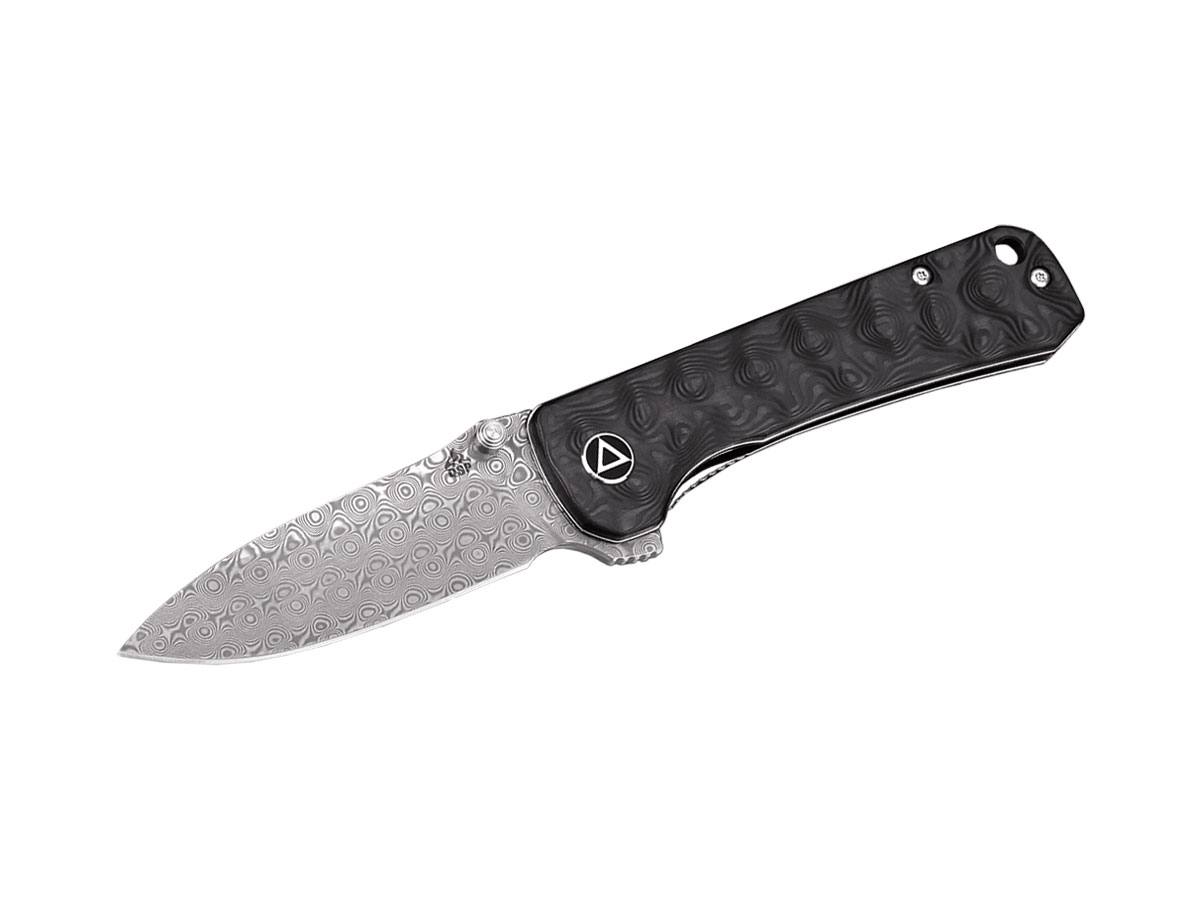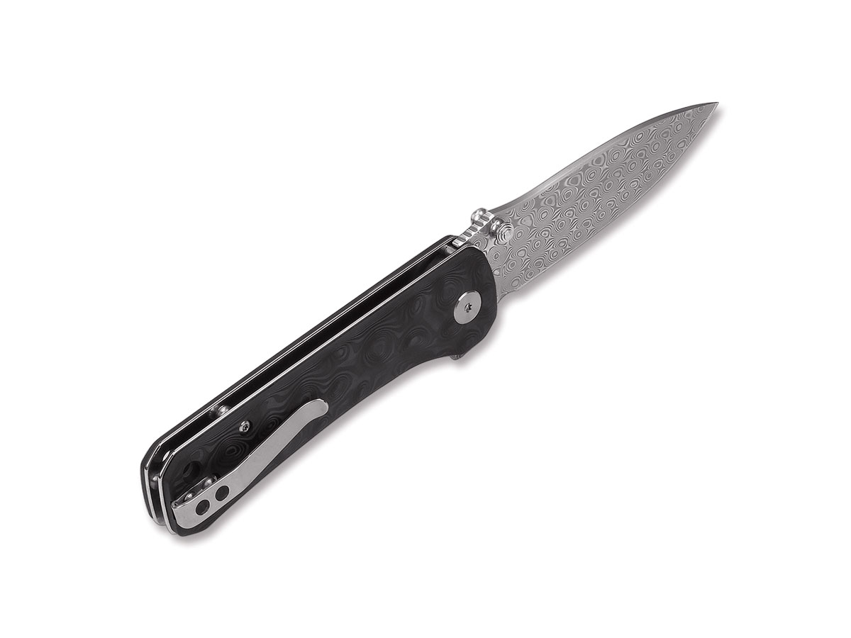 Questo modello Hawk ha un'impugnatura in fibra di carbonio marmorizzata e una lama in acciaio Damasco. E' compatto, con manico appena sufficiente per una presa completa e lama appena sufficiente per svolgere le attività di taglio quotidiane. Si può aprire con un flipper o con i due perni per pollice. Sul pomo, il coltello ha una clip da tasca profonda per il trasporto e un foro per cordino.