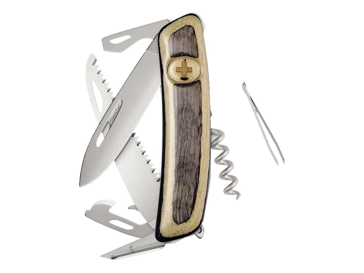 - Lama da 75 mm c/sistema di bloccaggio- Alesatore / Punteruolo da cucito c/asola- Levacapsula c/cacciavite piatto No. 3 e  piega fili- Apriscatole c/cacciavite piatto No. 1- Cavatappi - Pinzette-  Seghetto