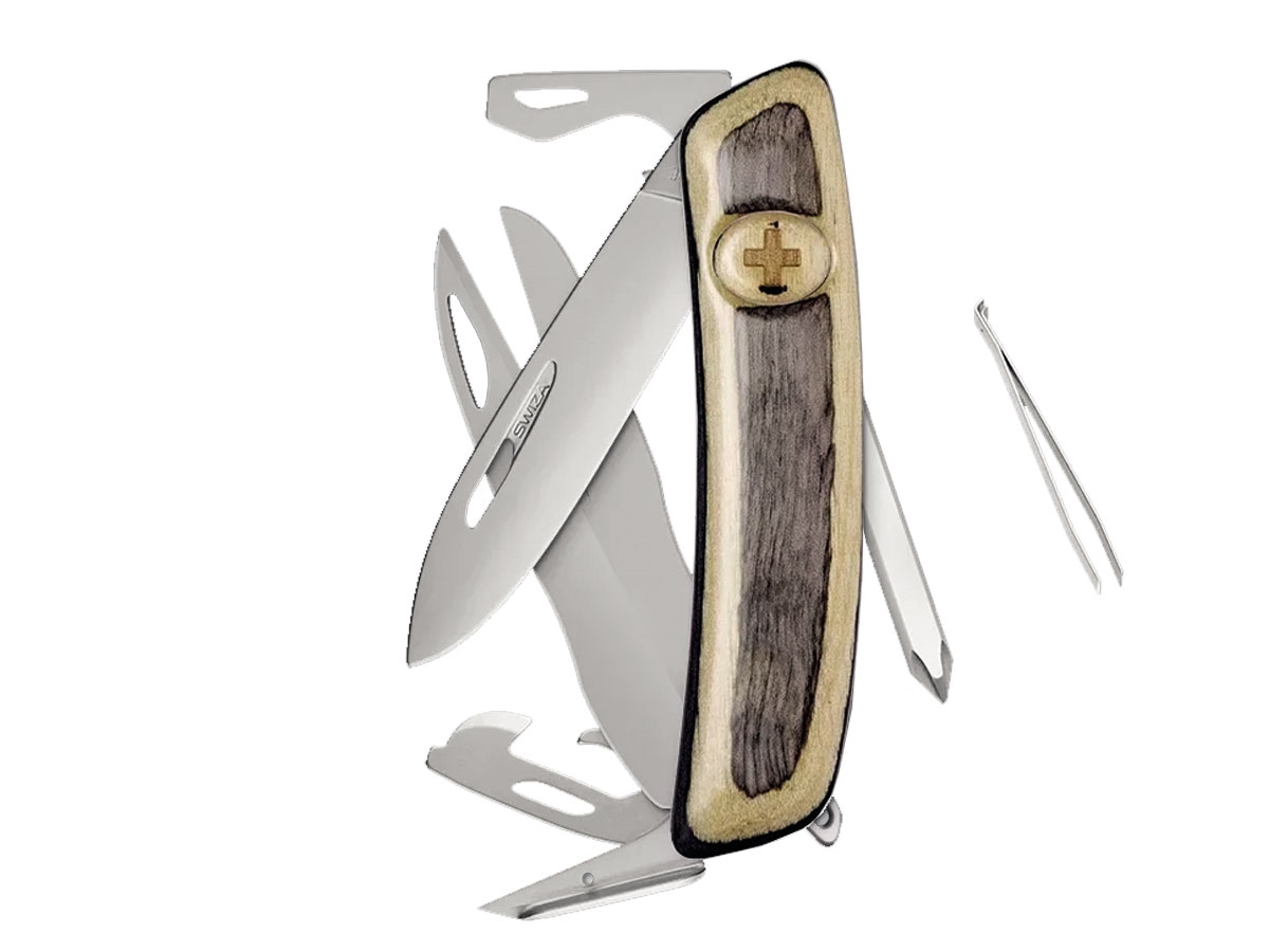 LAMA:    mm 75DIMENSIONE:    mm  95PESO:  gr  110DESIGN:  Design ergonomico rivoluzionario a 360 ° . Lama e attrezzi con unghiatura per facilitare l'apertura con la mano sinistra o destra.MATERIALE:  Costruzione compatta con piastre in acciaio. Lama in acciaio inox  440 extra solido, 57 HRc.FINITURA:  Superfici metalliche satinate e opache.MANICO:  Realizzato in laminato.SICUREZZA:  Lama con blocco di sicurezza per impedire la chiusura durante il  lavoro. La lama può essere sbloccata premendo la croce SWIZA.