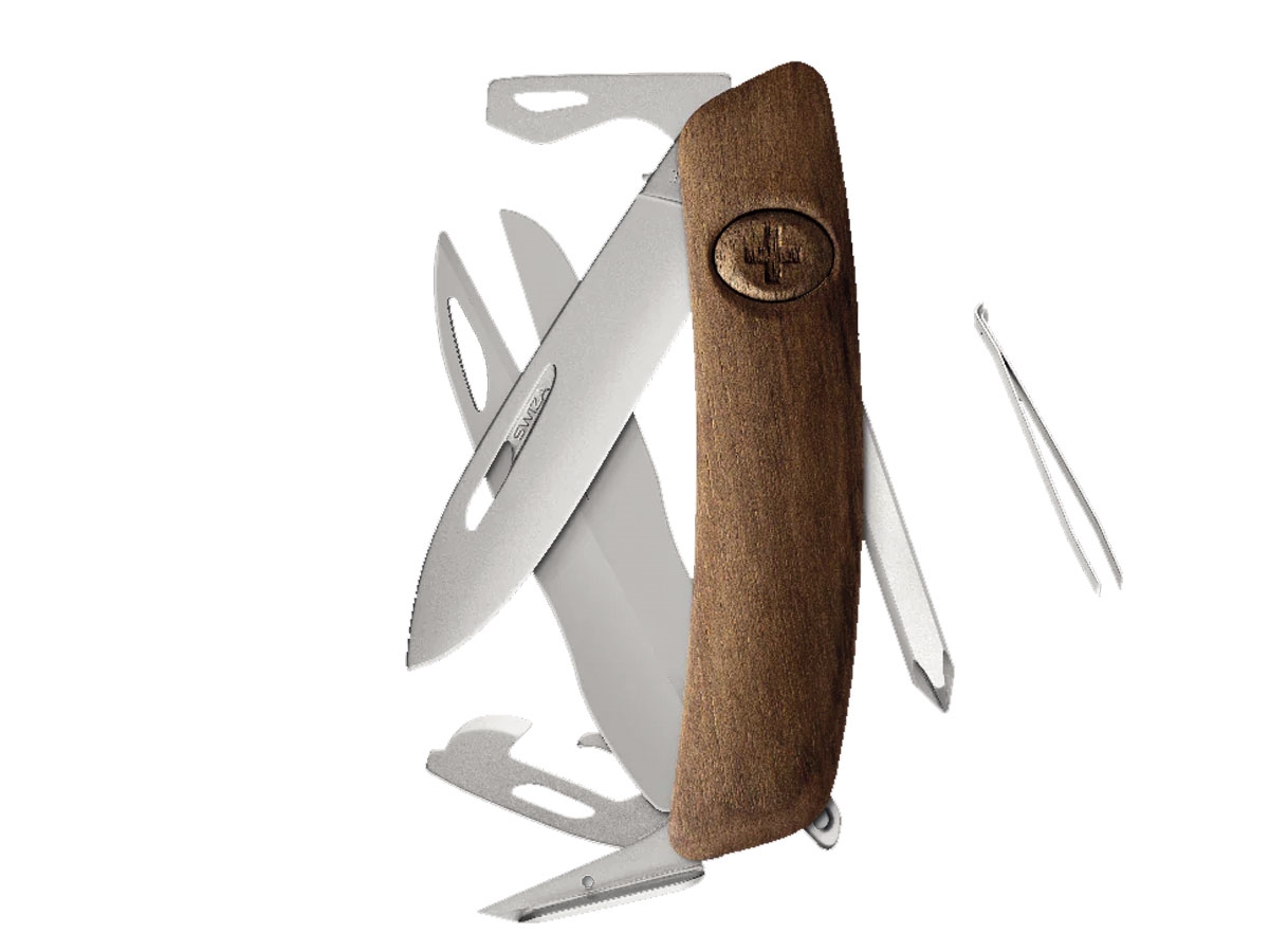 LAMA:    mm 75DIMENSIONE:    mm  95PESO:  gr  110DESIGN:  Design ergonomico rivoluzionario a 360 ° . Lama e attrezzi con unghiatura per facilitare l'apertura con la mano sinistra o destra.MATERIALE:  Costruzione compatta con piastre in acciaio. Lama in acciaio inox  440 extra solido, 57 HRc.FINITURA:  Superfici metalliche satinate e opache.MANICO:  Realizzato in legno di noce.SICUREZZA:  Lama con blocco di sicurezza per impedire la chiusura durante il  lavoro. La lama può essere sbloccata premendo la croce SWIZA.